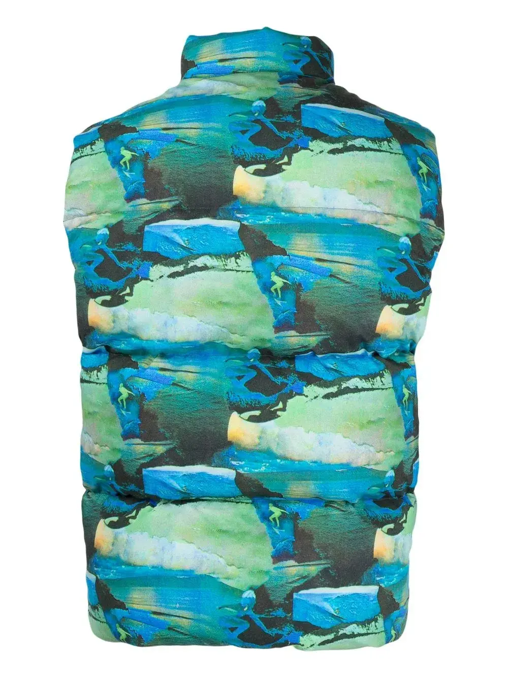 Синий, зеленый, хлопок, стеганая модель, сплошной графичный принт, высокий воротник, без рукавов, потайная застежка на кнопках спереди и прямой подол. Это унисекс-модель. Обратите внимание, что для нее используется мужская размерная сетка.