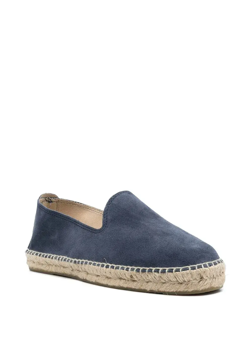 Синий, телячья кожа, джут, джутовая подошва, плоская резиновая подошва, тисненый логотип сзади, стелька с логотипом и закругленный носок.