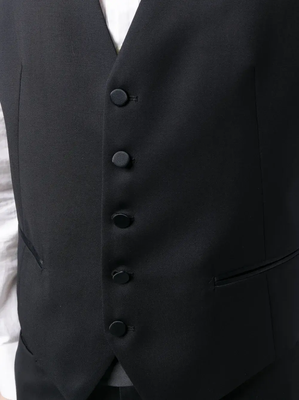 Темно-синий, необработанная шерсть, контрастный козырек, заостренные лацканы, застежка на пуговицах спереди, длинные рукава, шлица по центру сзади, без рукавов, застежка на пуговицах спереди, неравномерный подол, строгий крой, контрастный пояс, застежка на молнии и пуговице спереди, два вшитых кармана по бокам и два прорезных кармана на пуговицах сзади.