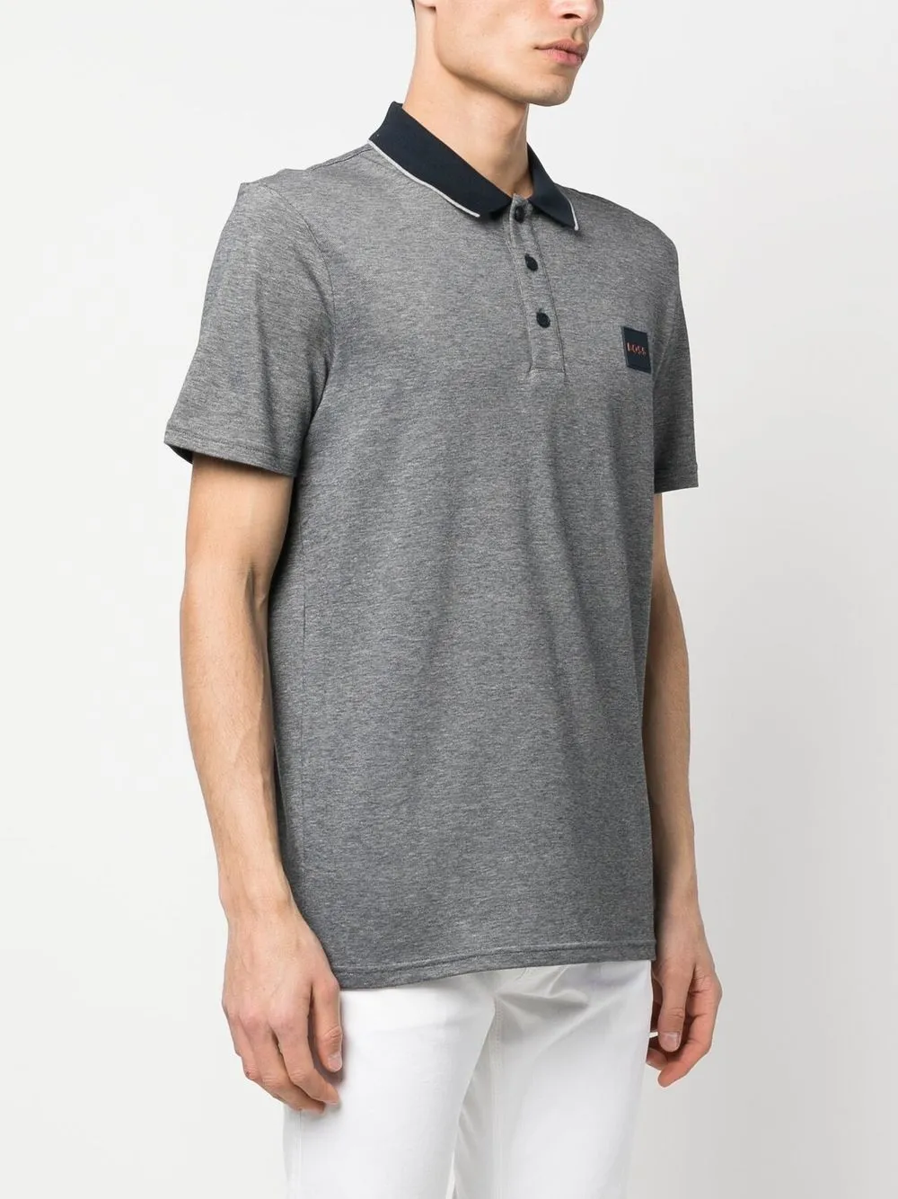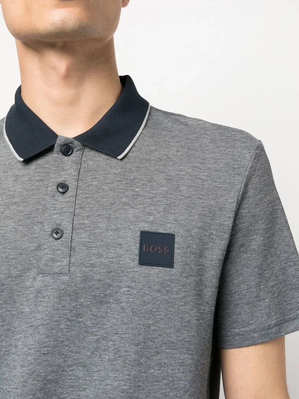 Нашивка с логотипом на груди, воротник поло и планка на пуговицах спереди.