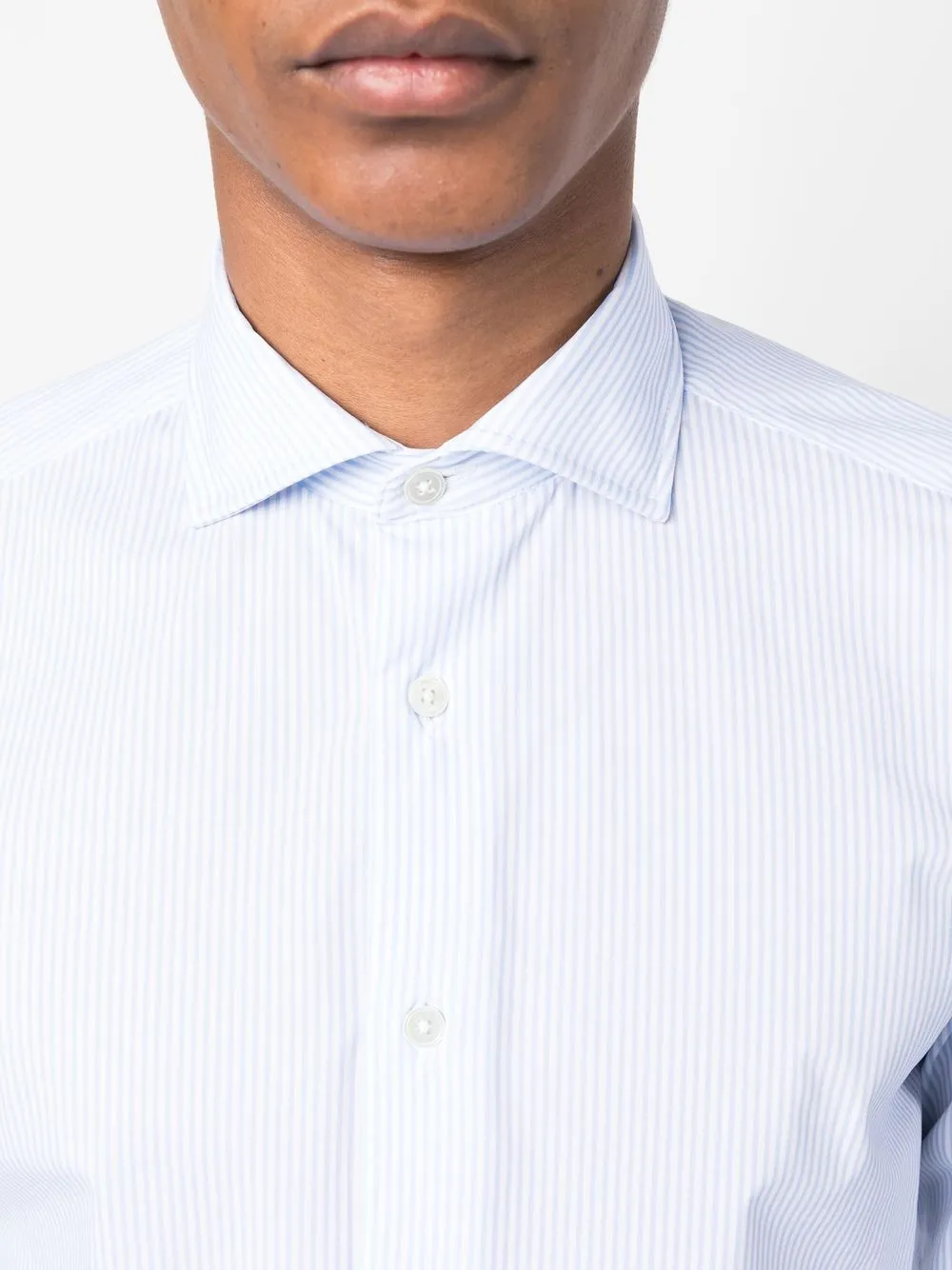 Синий/белый, эластичный материал, узор в вертикальную полоску, косой воротник, планка на пуговицах спереди, длинные рукава, манжеты на пуговицах и закругленный подол.