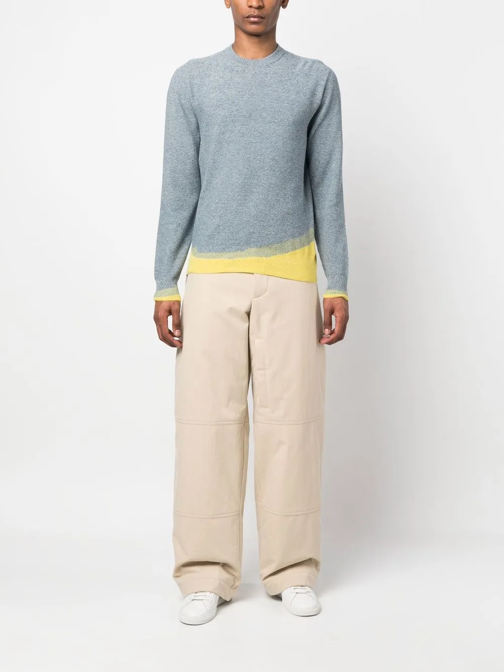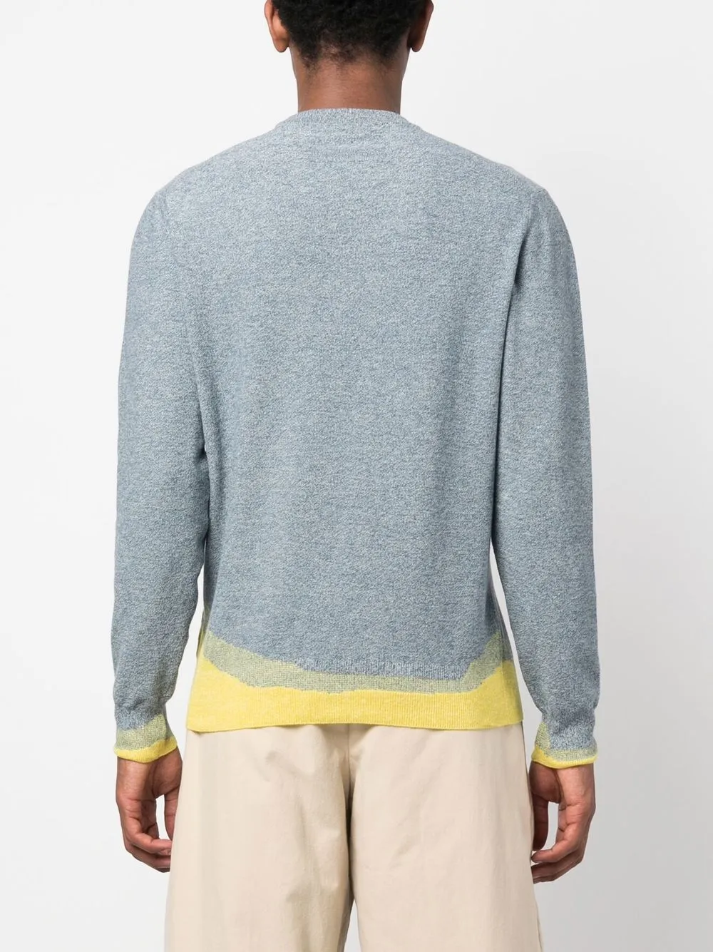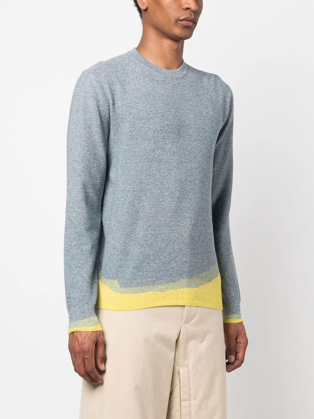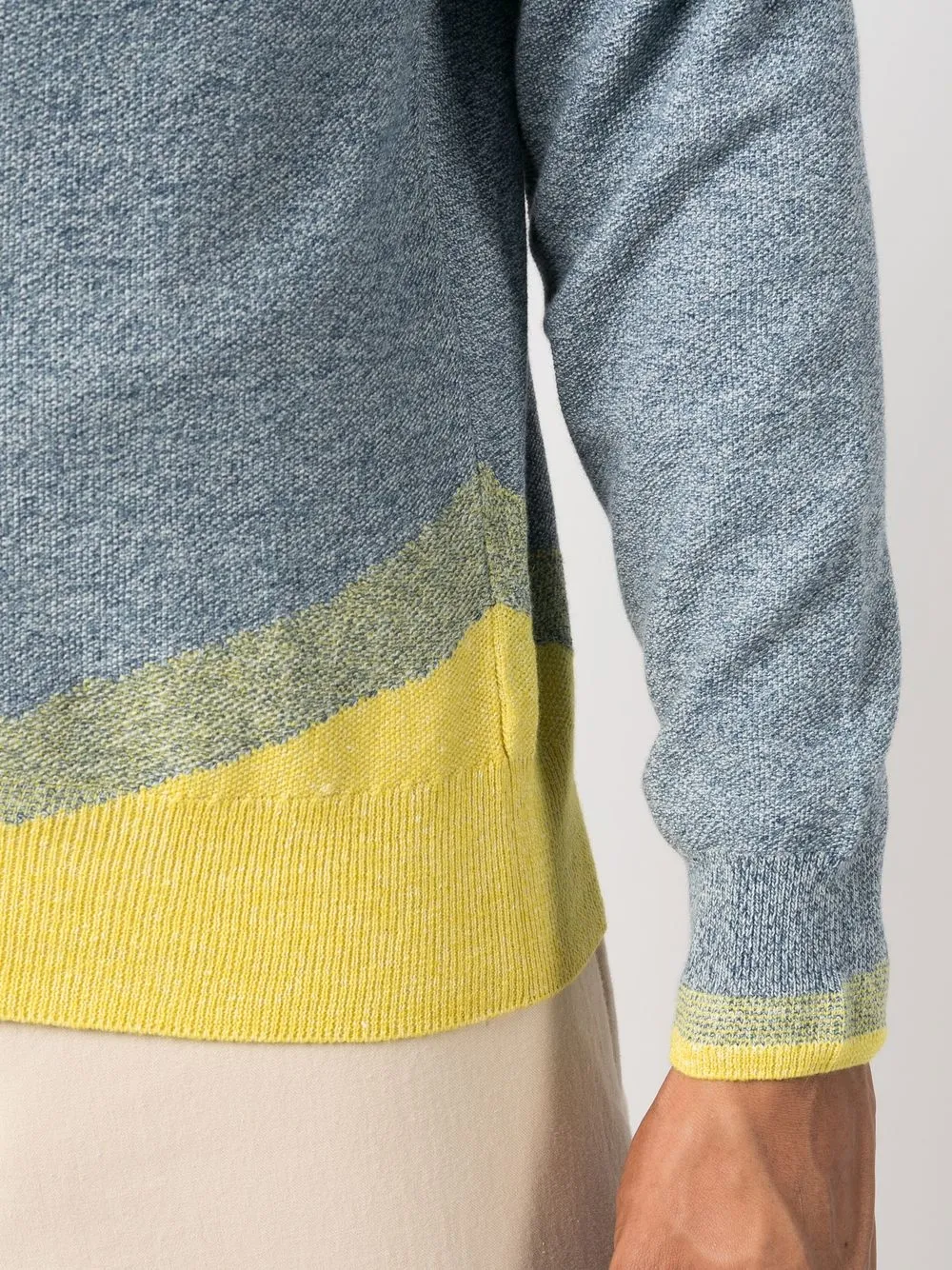 Голубой, канареечный, смесь хлопка и кашемира, градиентный эффект, трикотаж в рубчик, круглый вырез, длинные рукава и прямой подол.