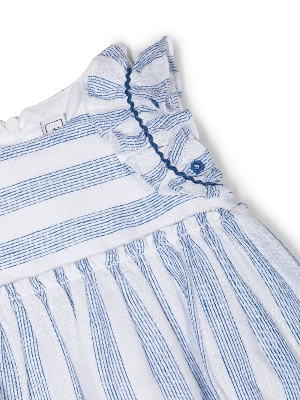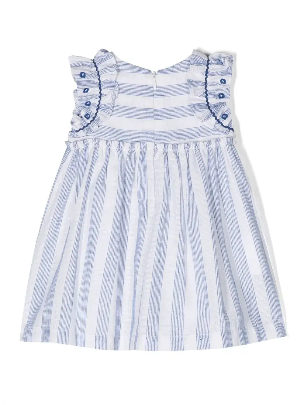 Синий/белый, хлопок, полоски, вставки с оборками, цветочная вышивка, контрастная отделка, круглый вырез, застежка на молнии сзади и расклешенный крой.