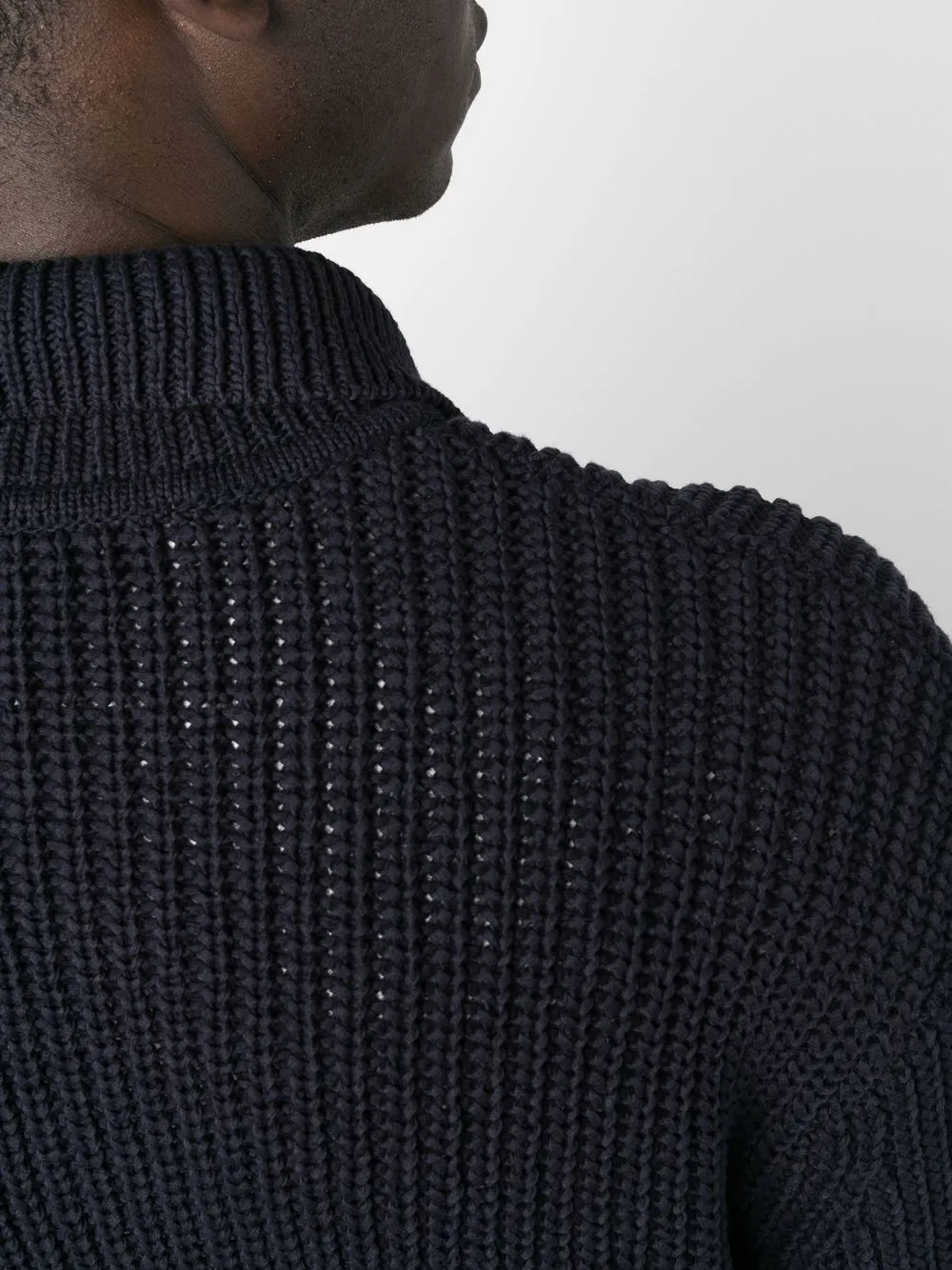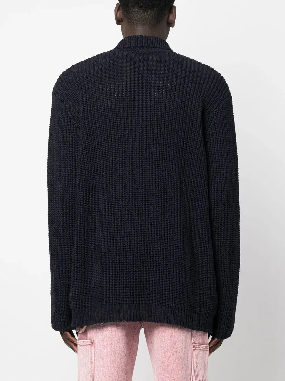 Темно-синий, хлопок, трикотаж в крупный рубчик, перламутровые пуговицы, отложной воротник, короткая застежка на пуговицах спереди, длинные рукава и прямой подол.