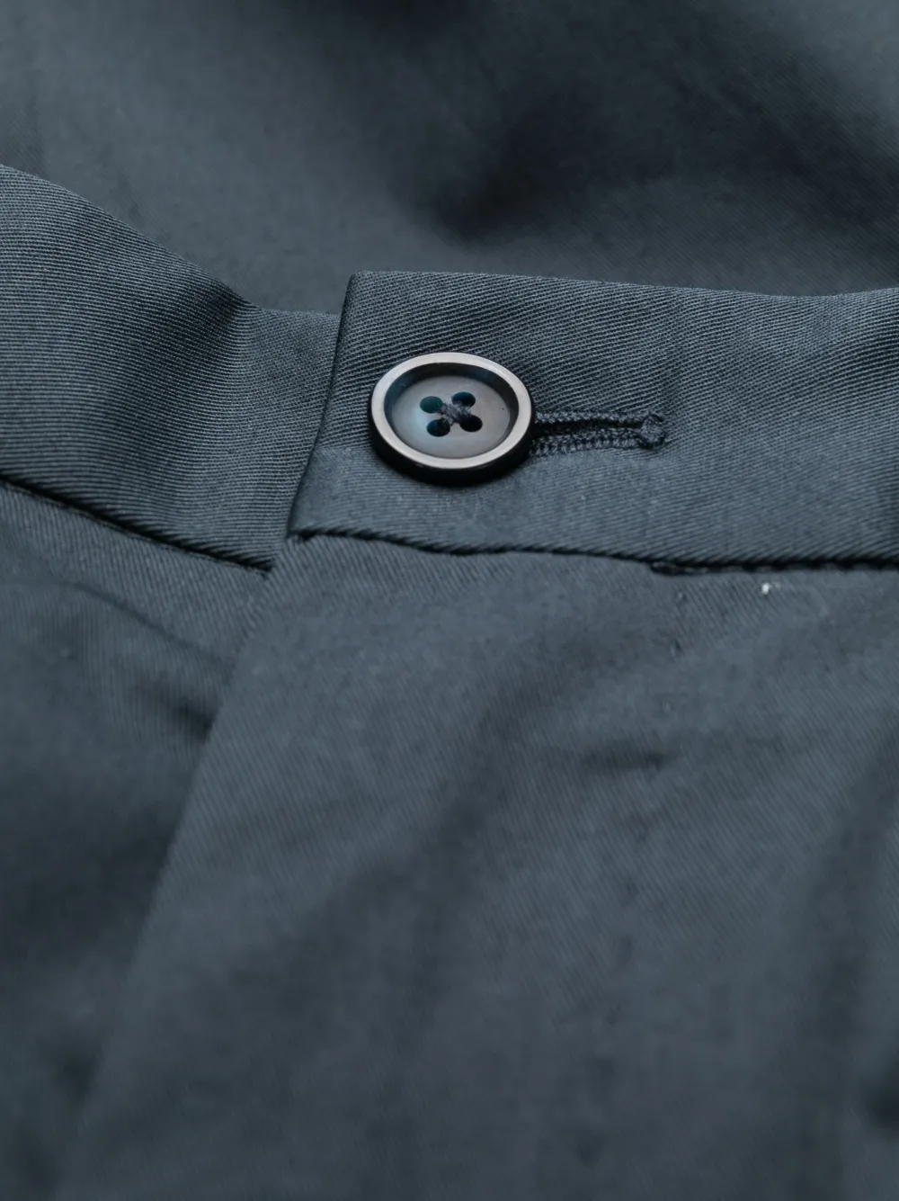 Стрелки, застежка на молнии и пуговице спереди, эластичный пояс сзади, два прорезных кармана по бокам, два прорезных кармана на пуговицах сзади и зауженный крой.