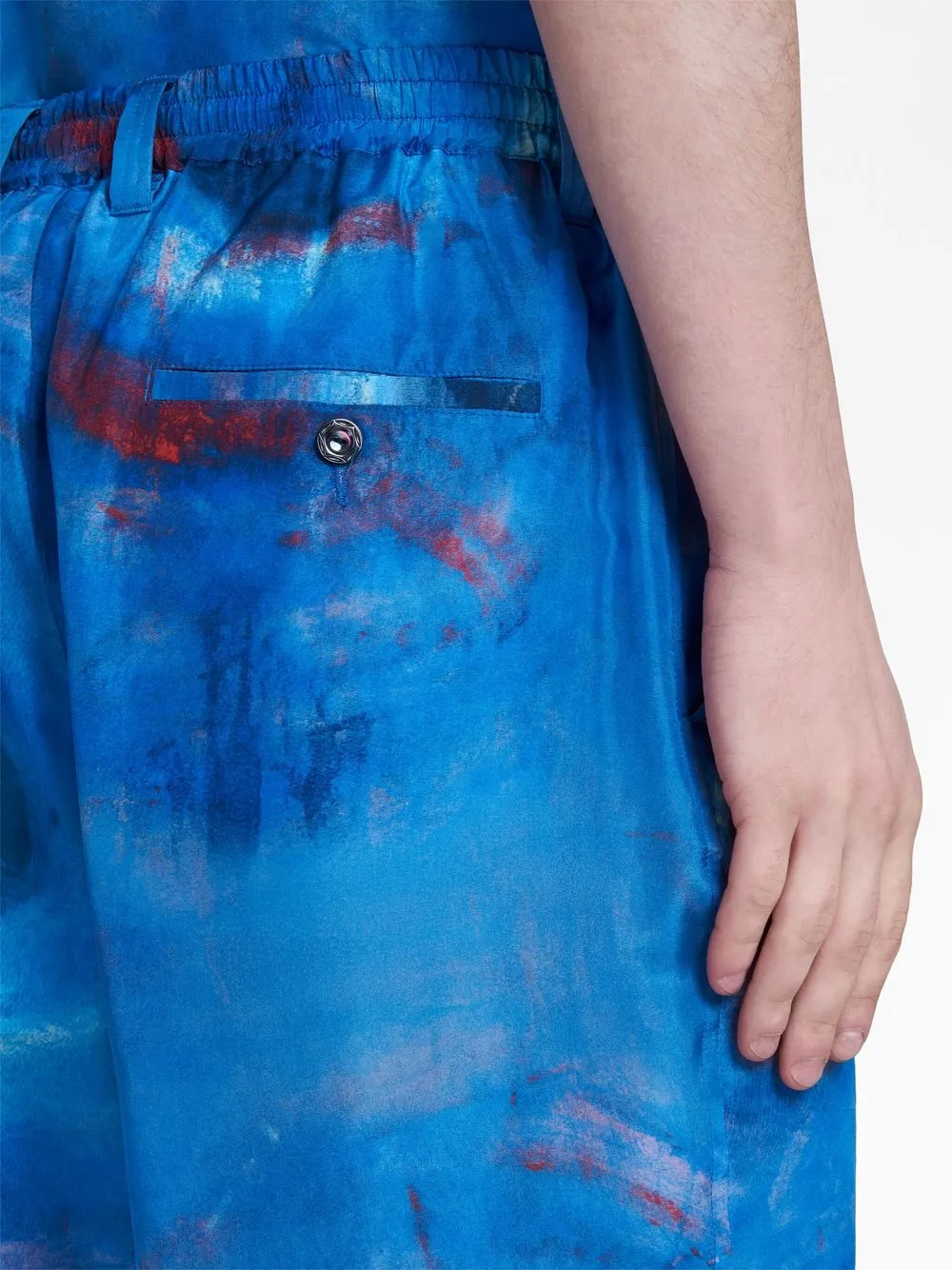 Кобальтово-синий, шелк, живописный принт, низкий шаговый шов, эластичный пояс, потайная застежка на молнии и пуговицах, задние карманы с листочкой и прямой подол.