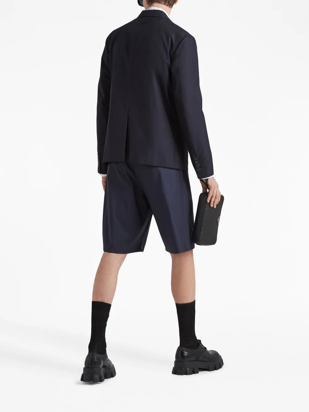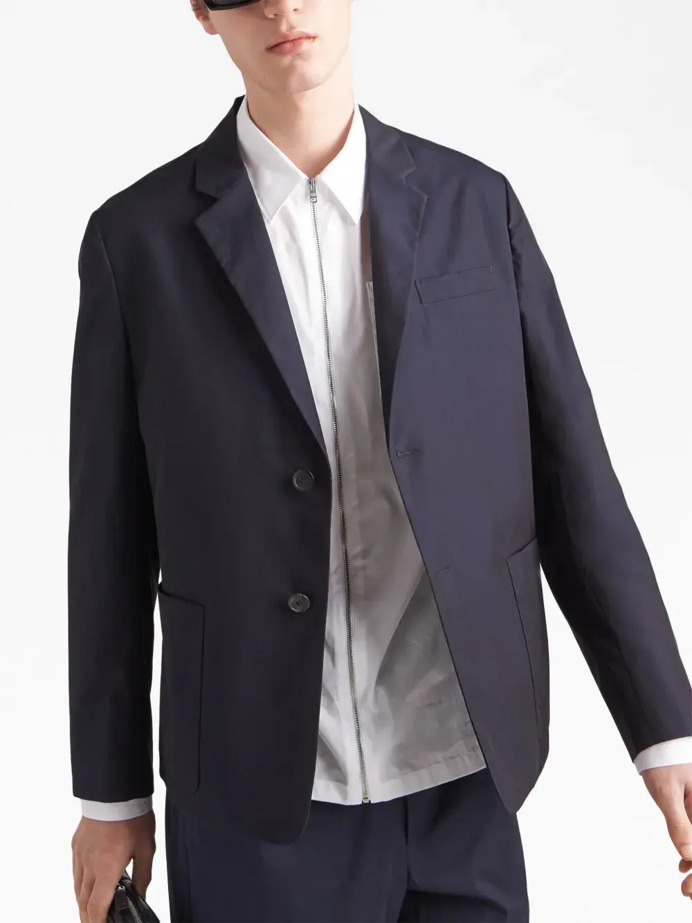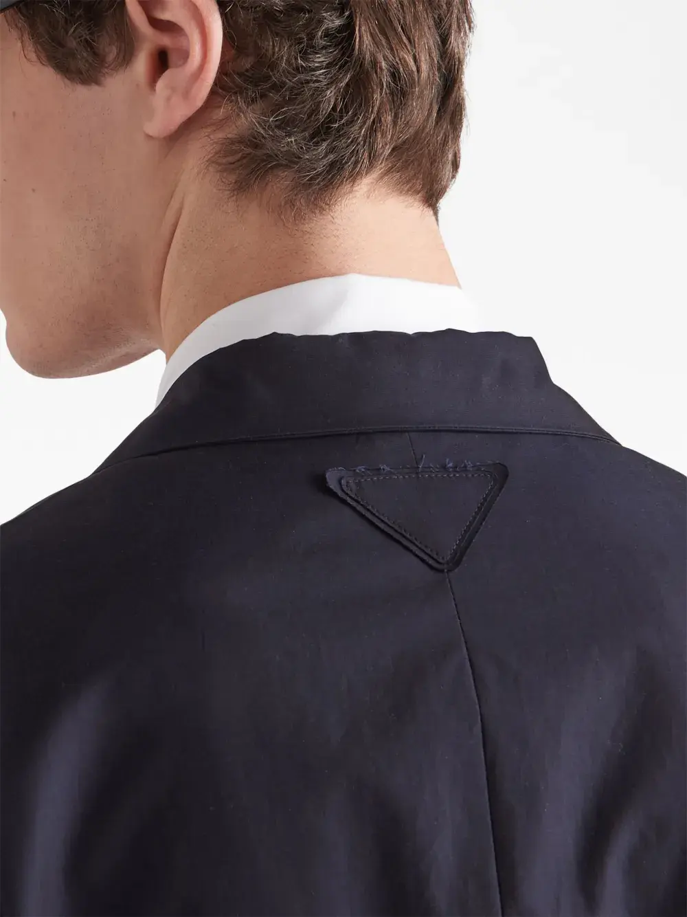 Темно-синий, хлопок, треугольный логотип, зазубренные лацканы, застежка на пуговицах спереди, длинные рукава, прорезной карман на груди, два накладных кармана спереди, шлица по центру сзади и частичная подкладка.