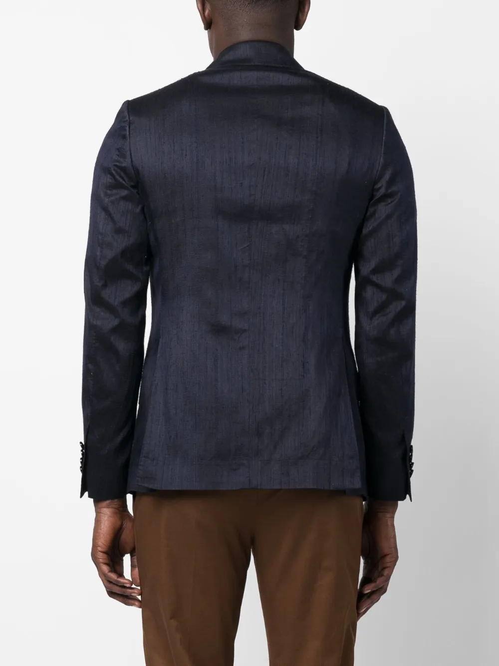 Темно-синий, шелк, шантунг, заостренные лацканы, двубортная застежка на кнопки, длинные рукава, манжеты на пуговицах, две боковые шлицы сзади, два кармана с клапанами по бокам и прорезной карман на груди.