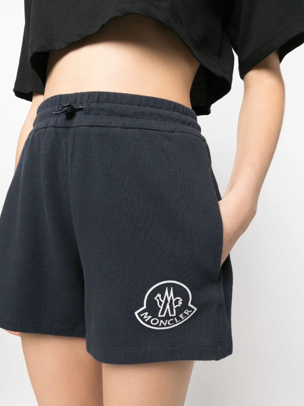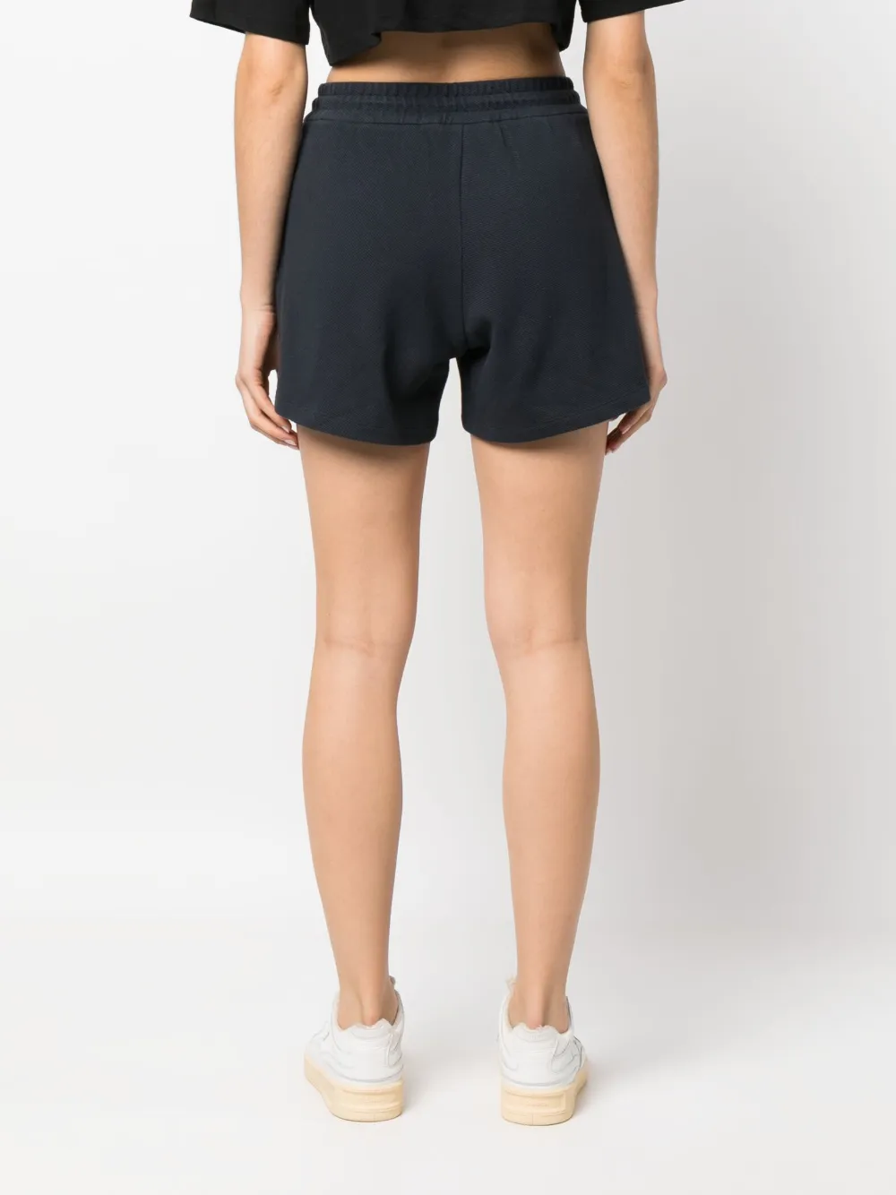 Темно-синий, хлопок, логотип на подоле, кулиска на талии и длина до бедер.
