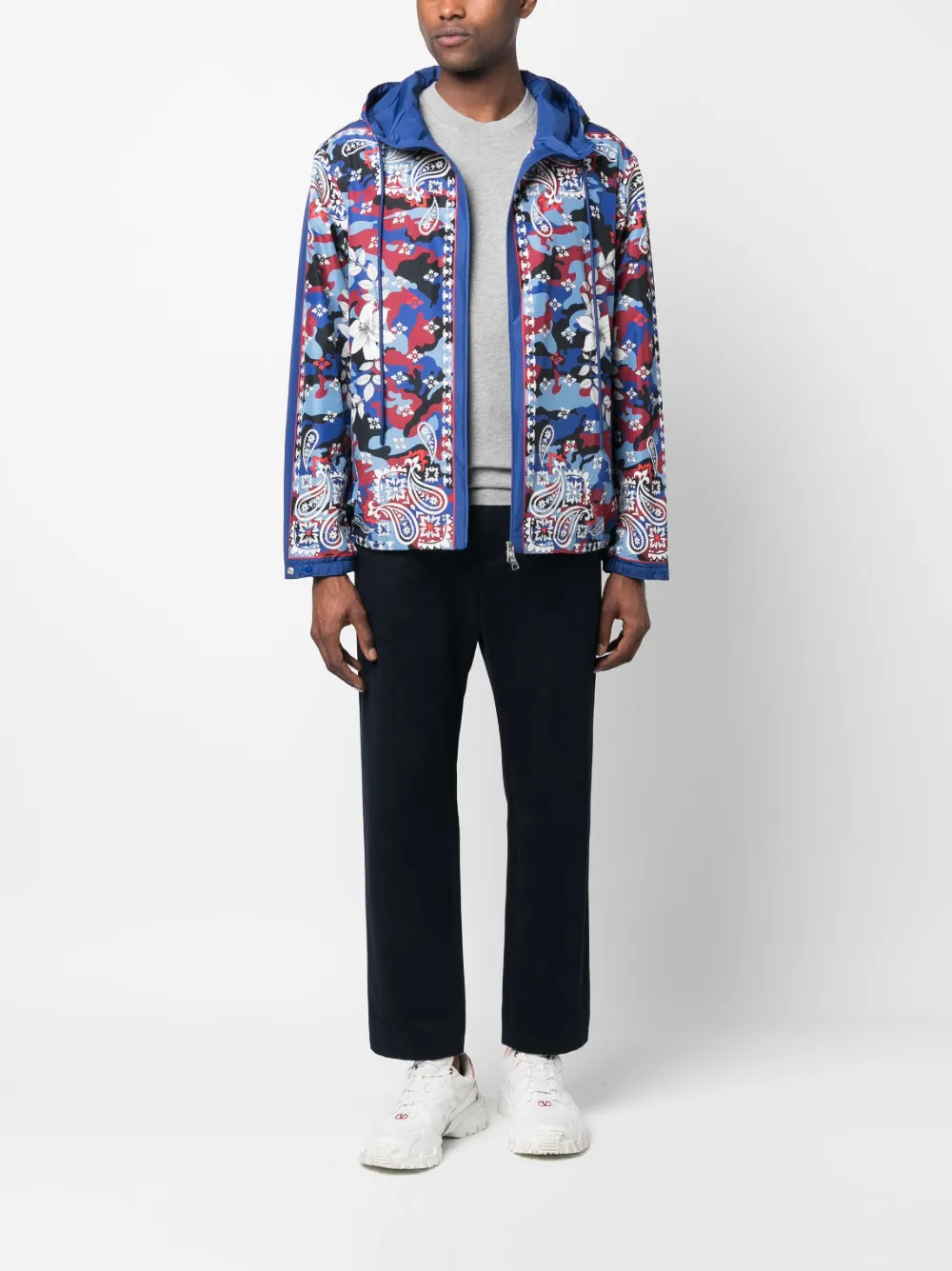 Синий, разноцветный, смешанный принт, затягивающийся на шнурок капюшон, застежка на молнии спереди, два кармана на молнии по бокам, длинные рукава, эластичные манжеты и прямой подол.
