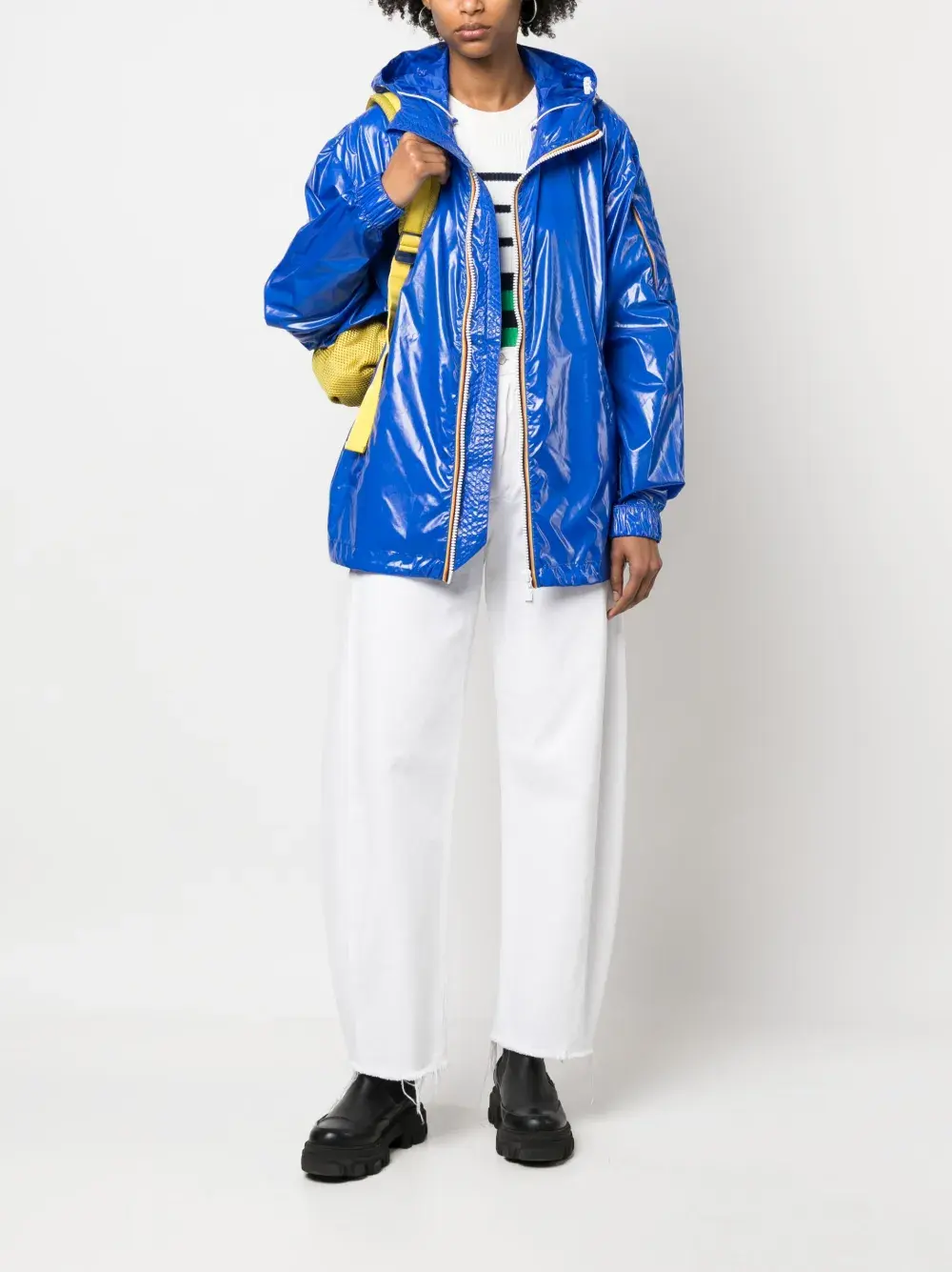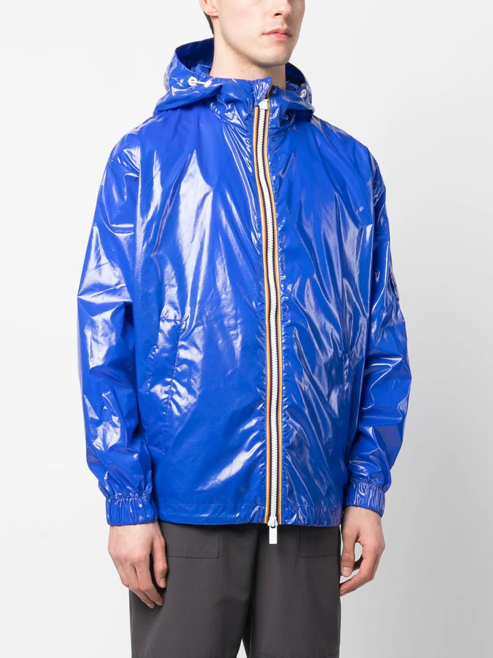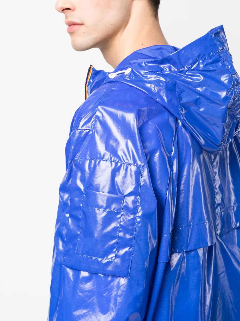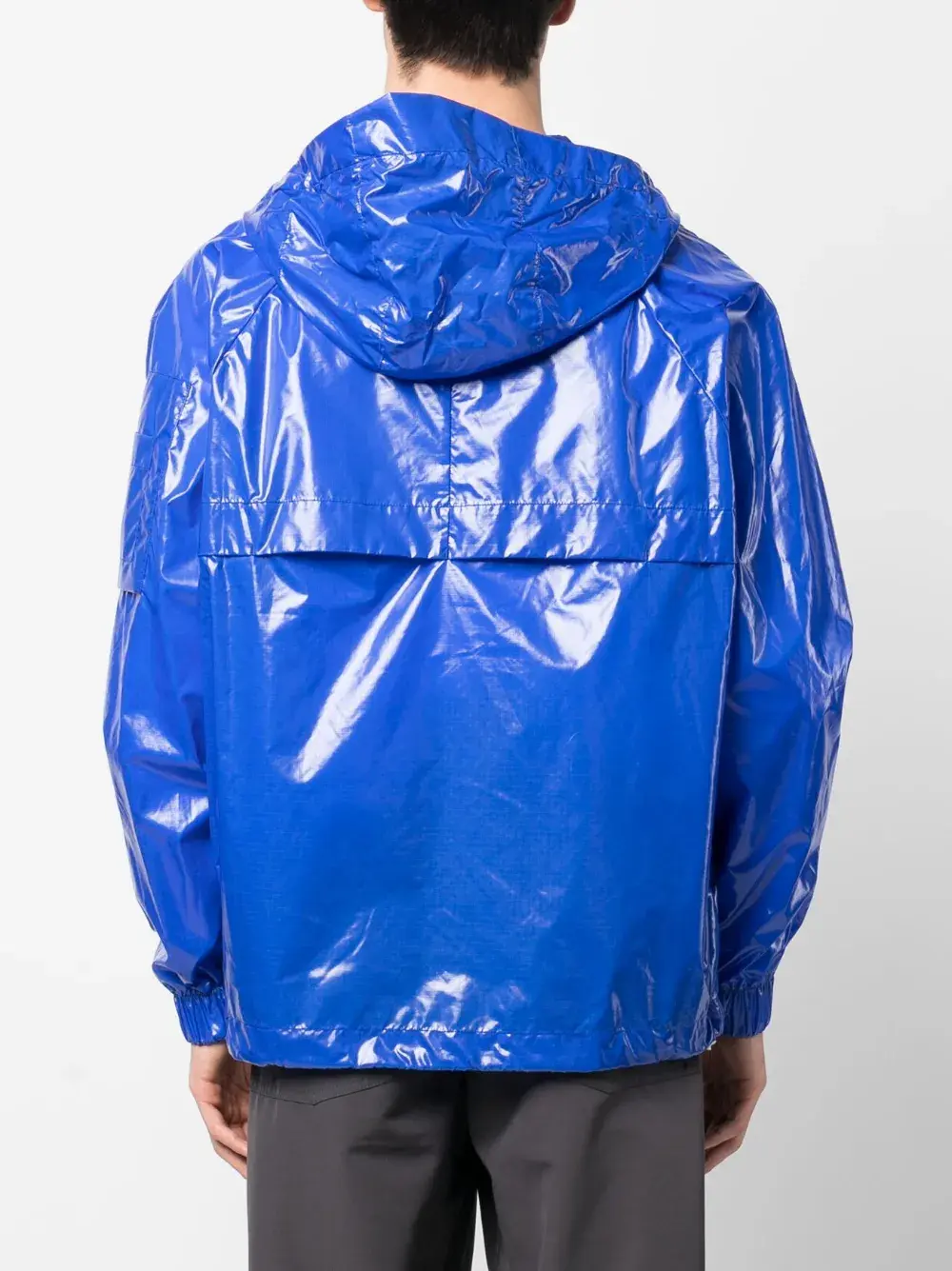 Синий, лакированная отделка, высокий воротник, затягивающийся на шнурок капюшон, двусторонняя молния спереди, два передних кармана с листочкой, накладной карман на рукаве, эластичные манжеты, прямой подол и регулируемый дизайн. Это унисекс-модель. Обратите внимание, что для нее используется мужская размерная сетка.