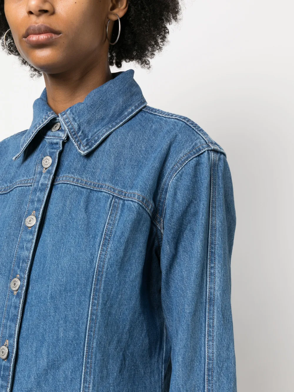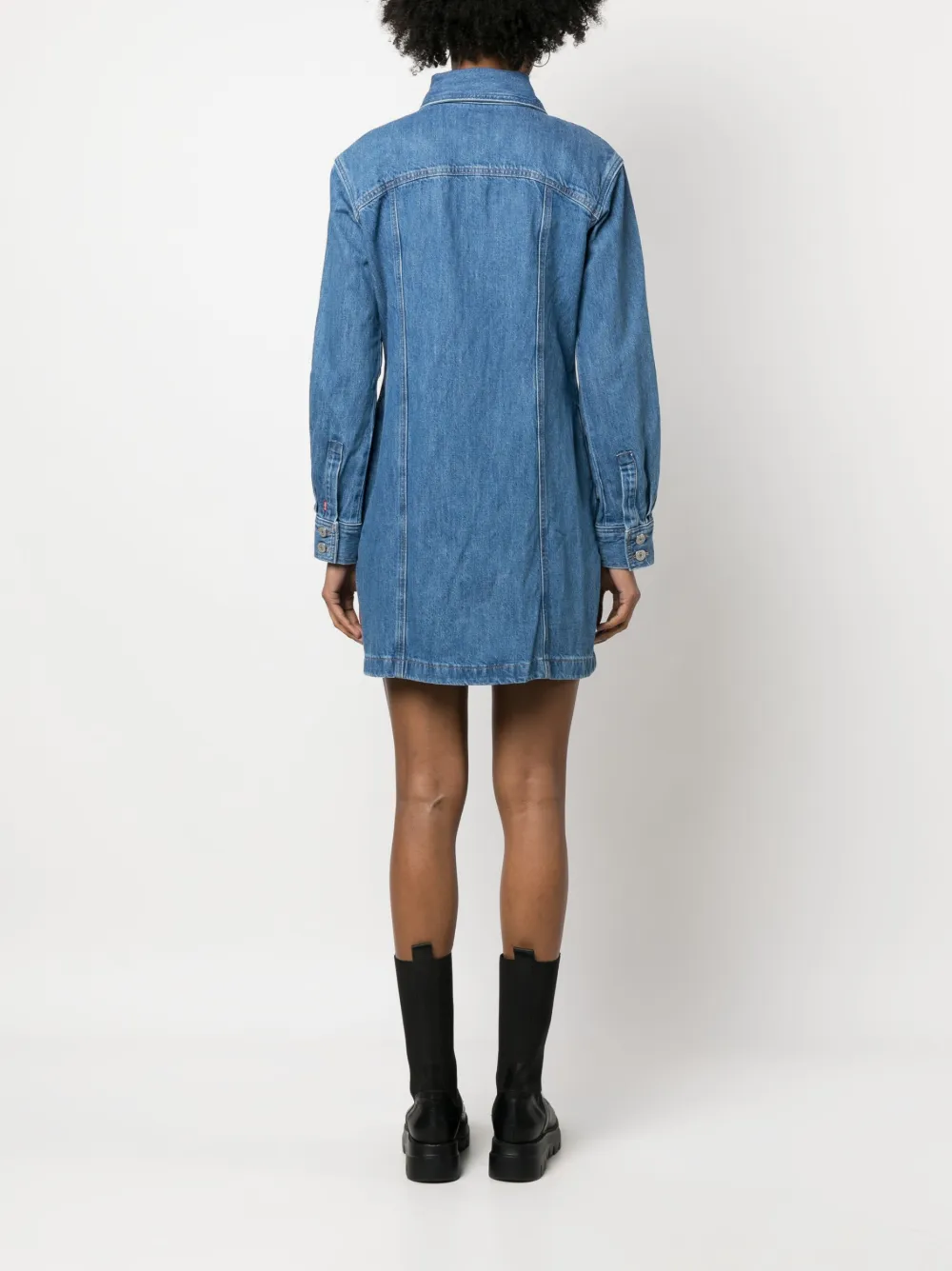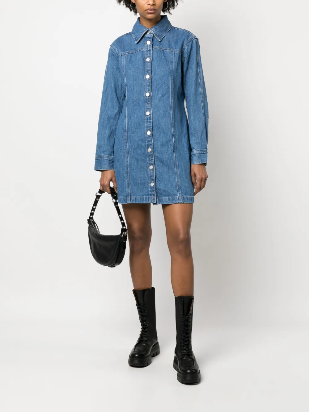 Голубой, хлопок, деним, классический воротник, застежка на молнии спереди, длинные рукава и длина выше колена.