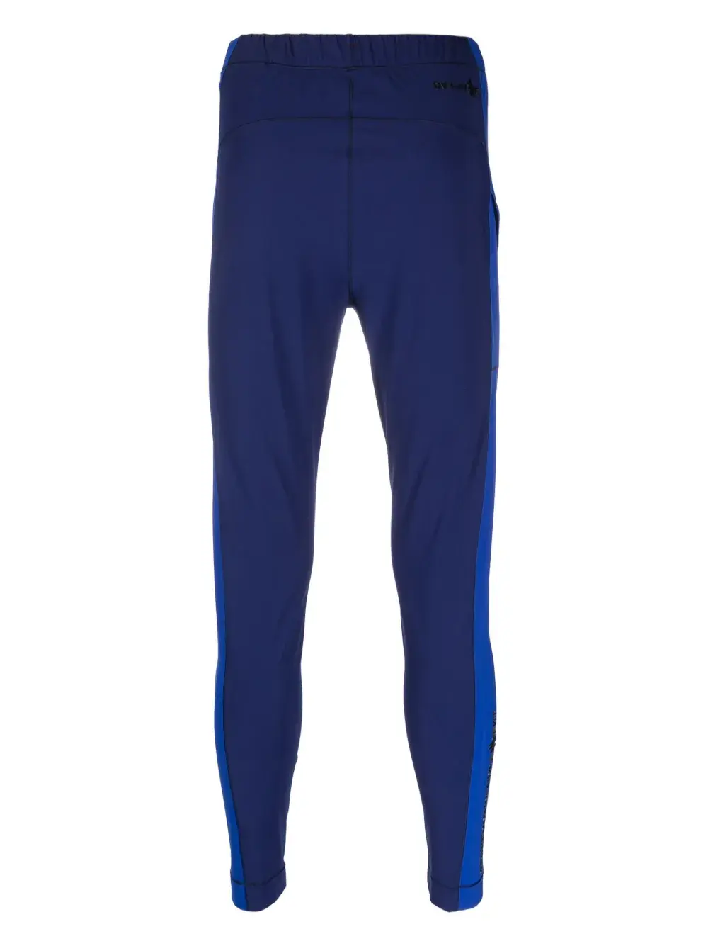 Синий, эластичный материал, швы, тисненый логотип сзади, принт с логотипом, эластичный пояс и облегающий крой.