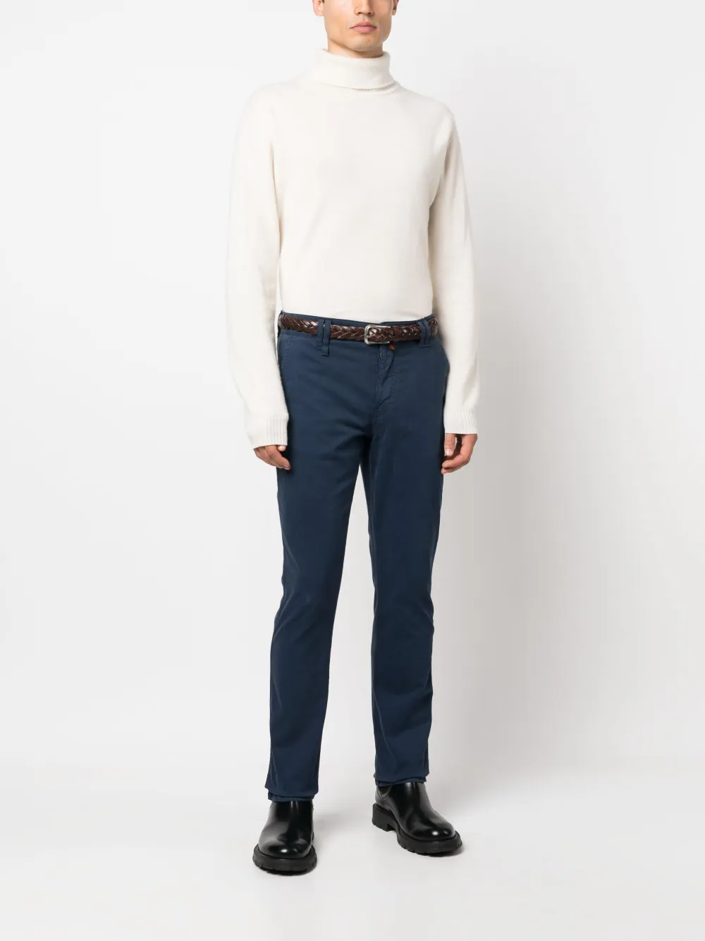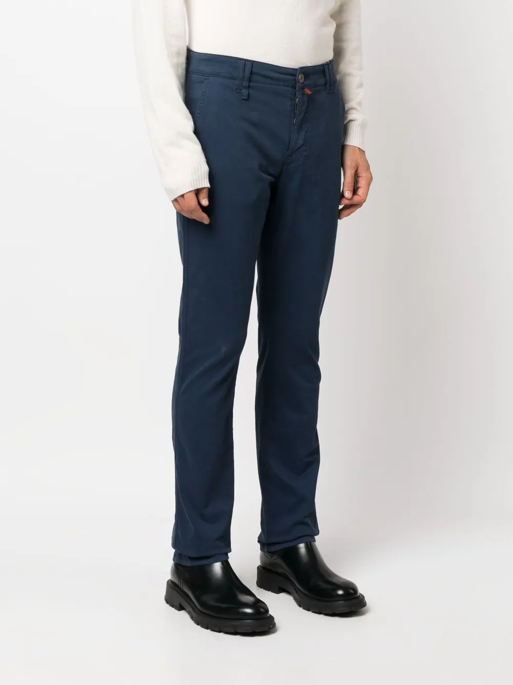 Синий, эластичный хлопок, вышитый логотип сзади, маленькая подвеска с логотипом, петли для ремня, застежка на пуговицах спереди, средняя посадка, зауженный крой, два вшитых кармана по бокам и два кармана с листочкой сзади.