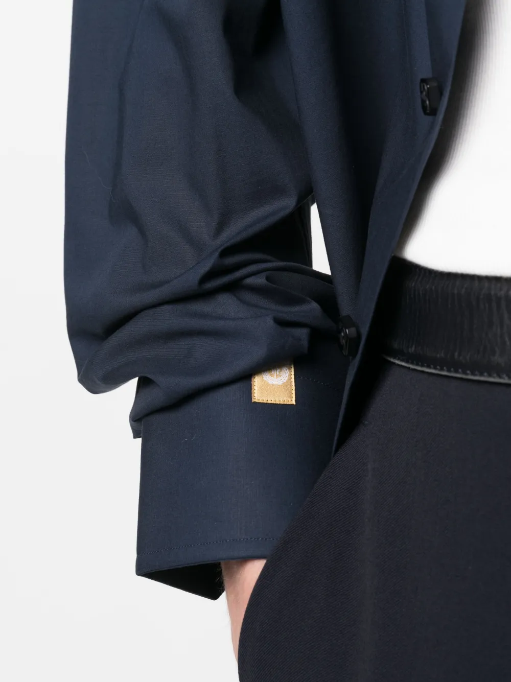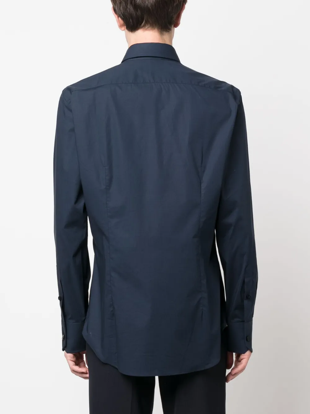 Темно-синий, смесовый хлопок, вышитый узор, нашивка с логотипом на рукаве, классический воротник, застежка на пуговицах спереди и длинные рукава.