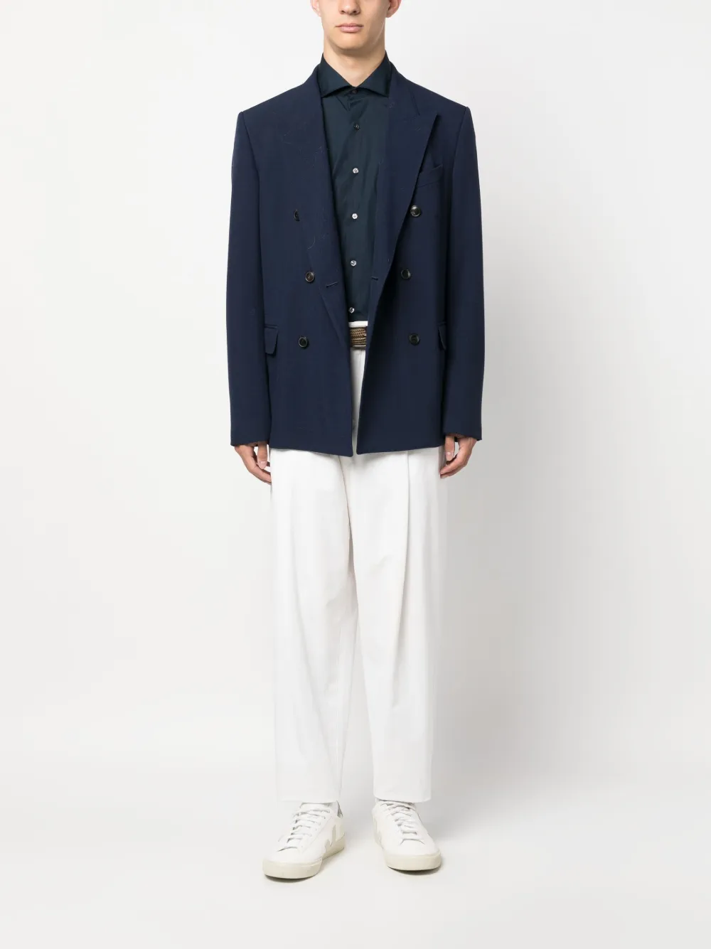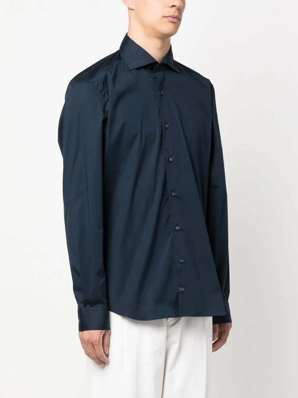 Темно-синий, эластичный хлопок, отложной воротник, застежка на пуговицах спереди, длинные рукава, манжеты на пуговицах и закругленный подол.