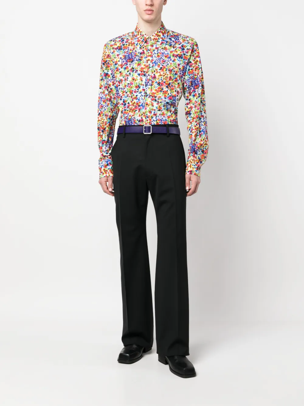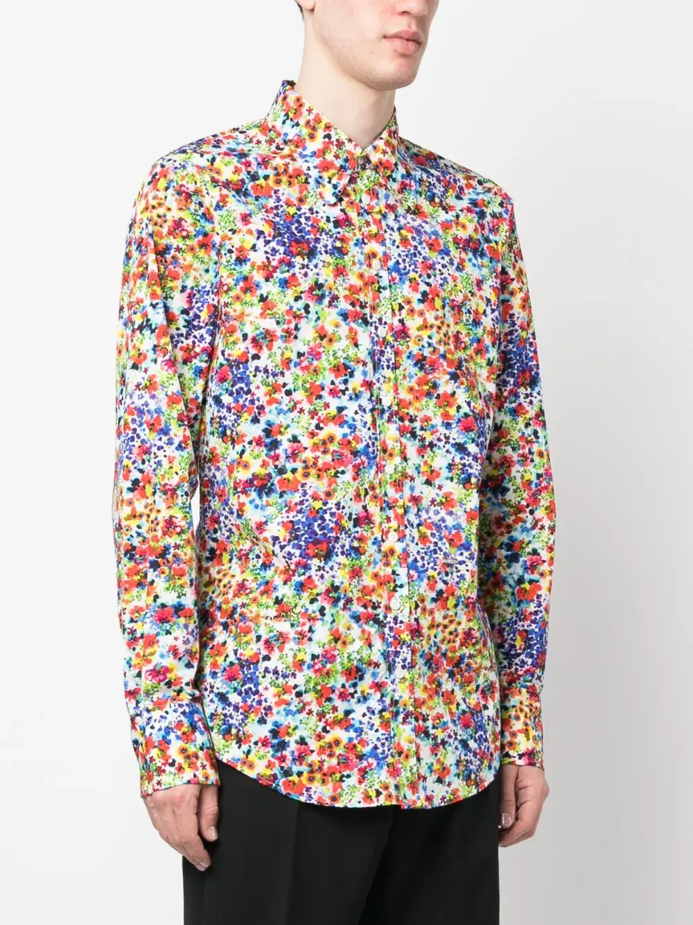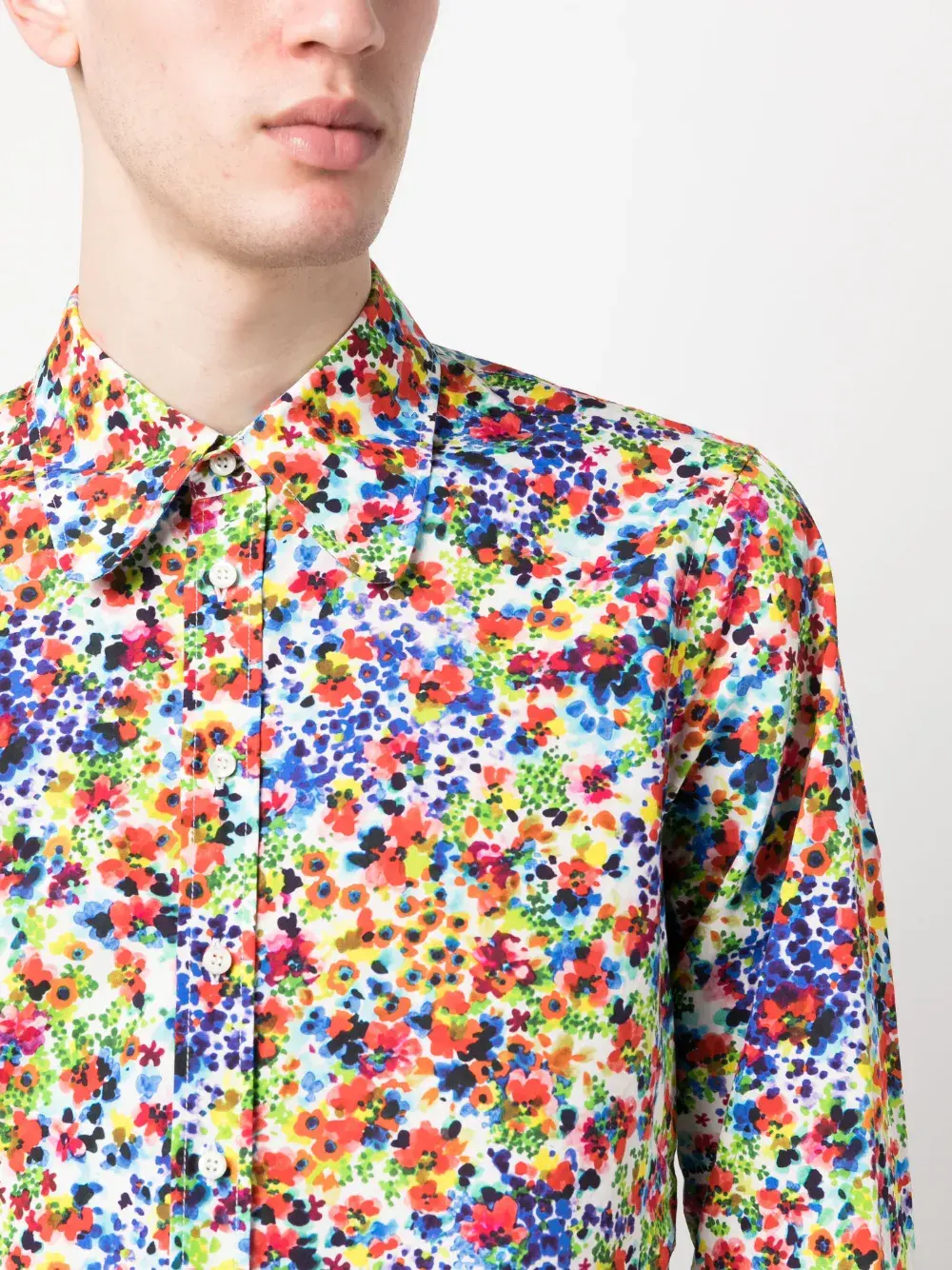 Синий, разноцветный, хлопок, сплошной цветочный принт, классический воротник, длинные рукава, манжеты на пуговицах, застежка на пуговицах спереди и закругленный подол.