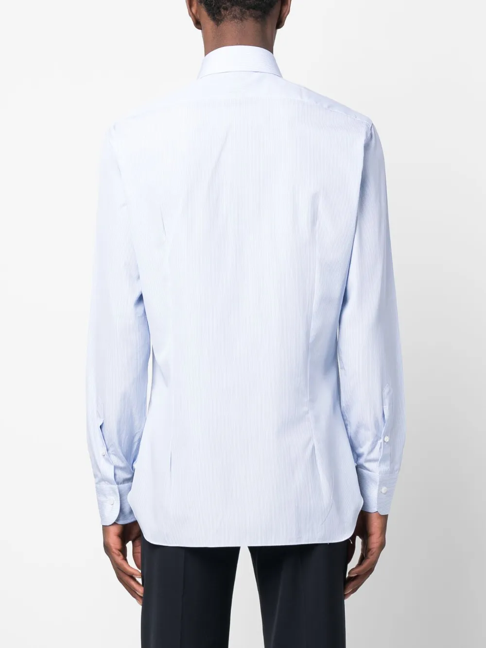 Голубой, хлопок, классический воротник, узор в вертикальную полоску, застежка на пуговицах спереди, манжеты на пуговицах, длинные рукава и закругленный подол.