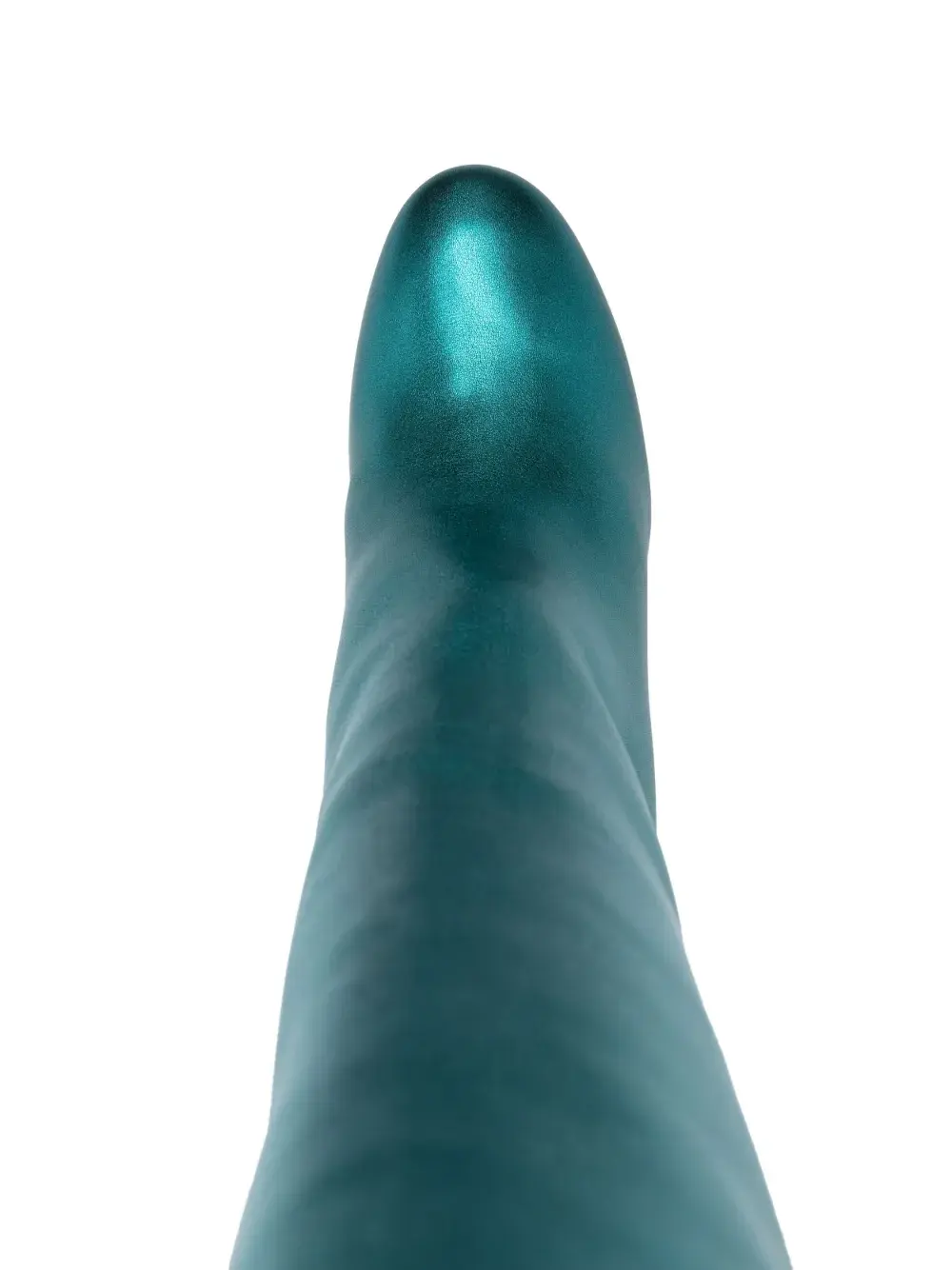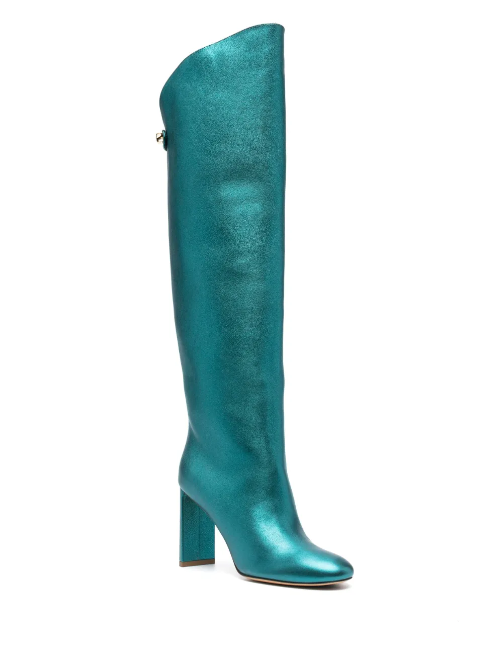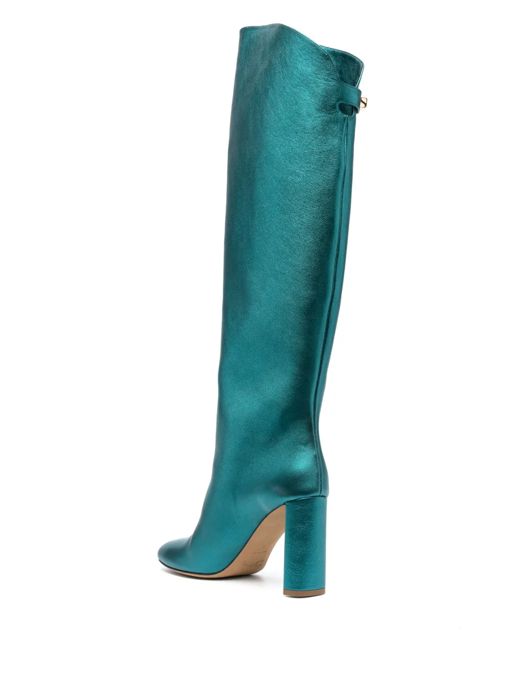 Сине-зеленый, телячья кожа, покрытие с эффектом металлик, зернистая текстура, золотистая фурнитура, ремешки, модель без застежки, высота по колено, высокий блочный каблук и закругленный носок.