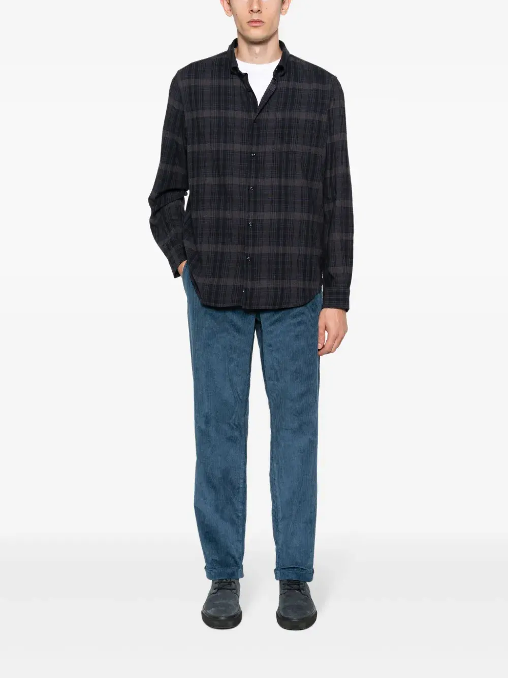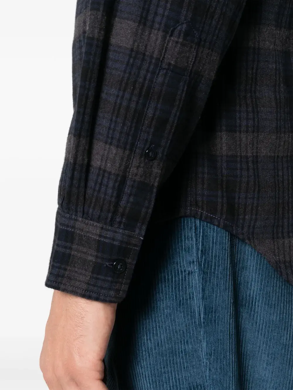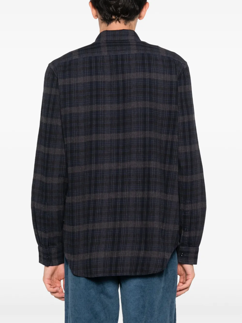 Синий, хлопок, фланель, клетчатый узор, отложной воротник, застежка на пуговицах спереди, длинные рукава, манжеты на пуговицах и закругленный подол.