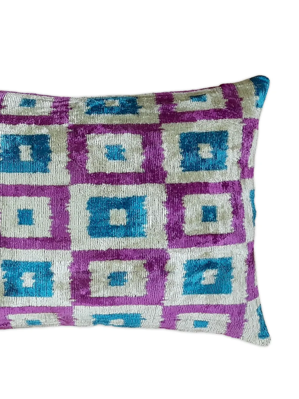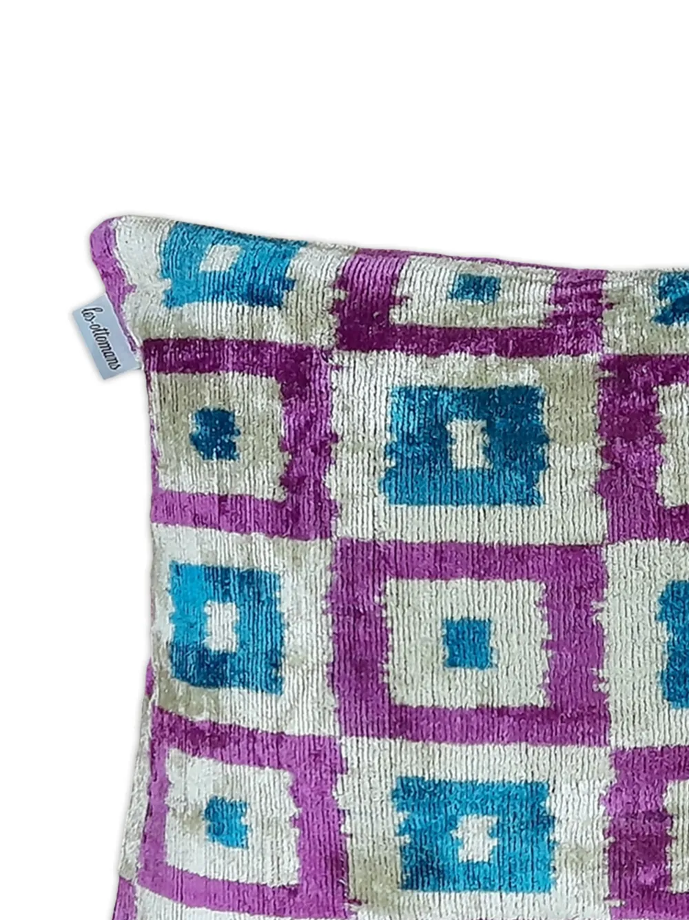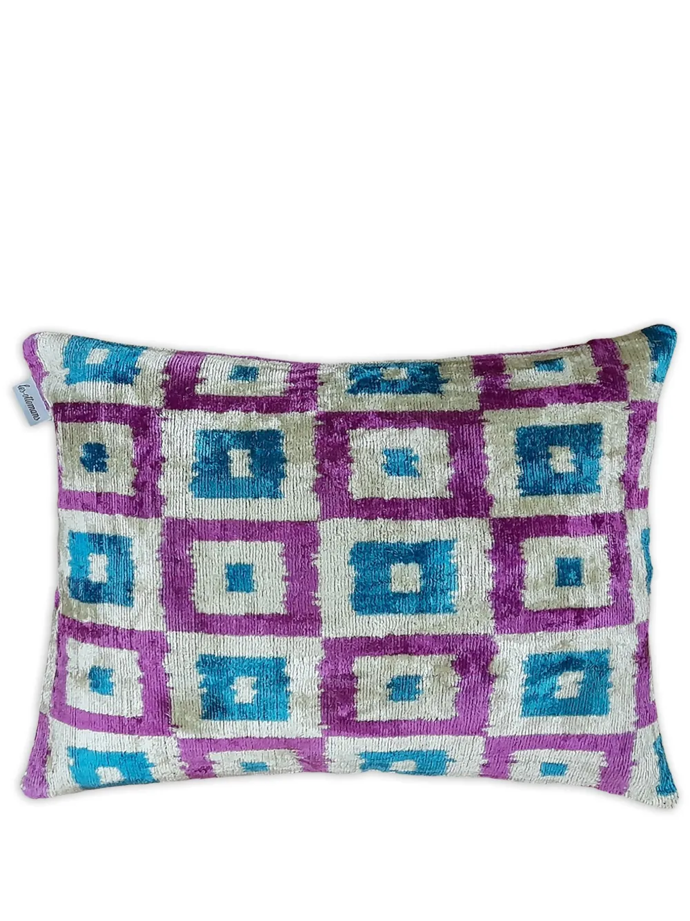 Фиолетовый, синий, белый, бархат, шелк, хлопок, геометричный принт, маленькая подвеска с логотипом и прямоугольная форма.