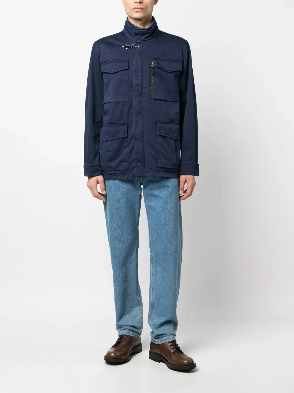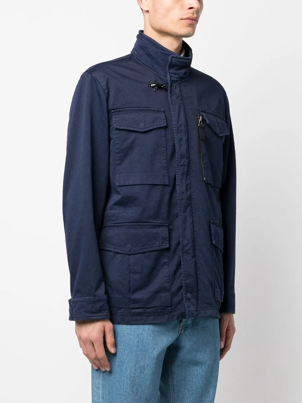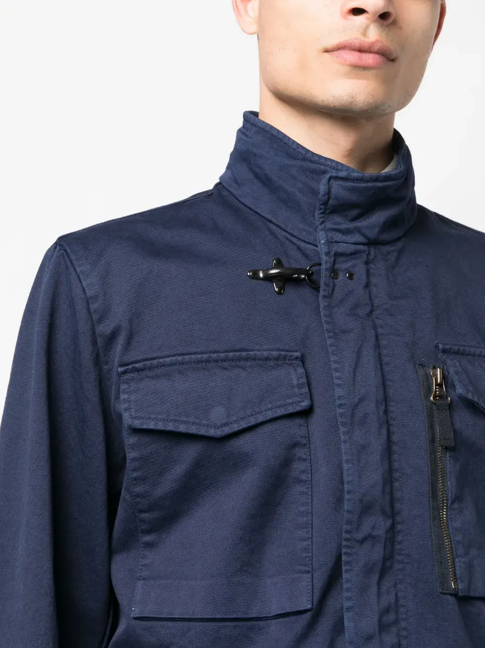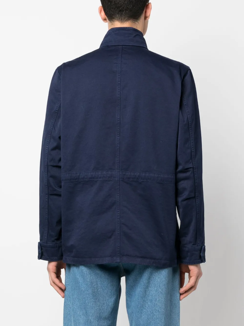 Темно-синий, хлопок, швы, высокий воротник, застежка на зажиме спереди, длинные рукава, два нагрудных кармана на молнии и накладные карманы.
