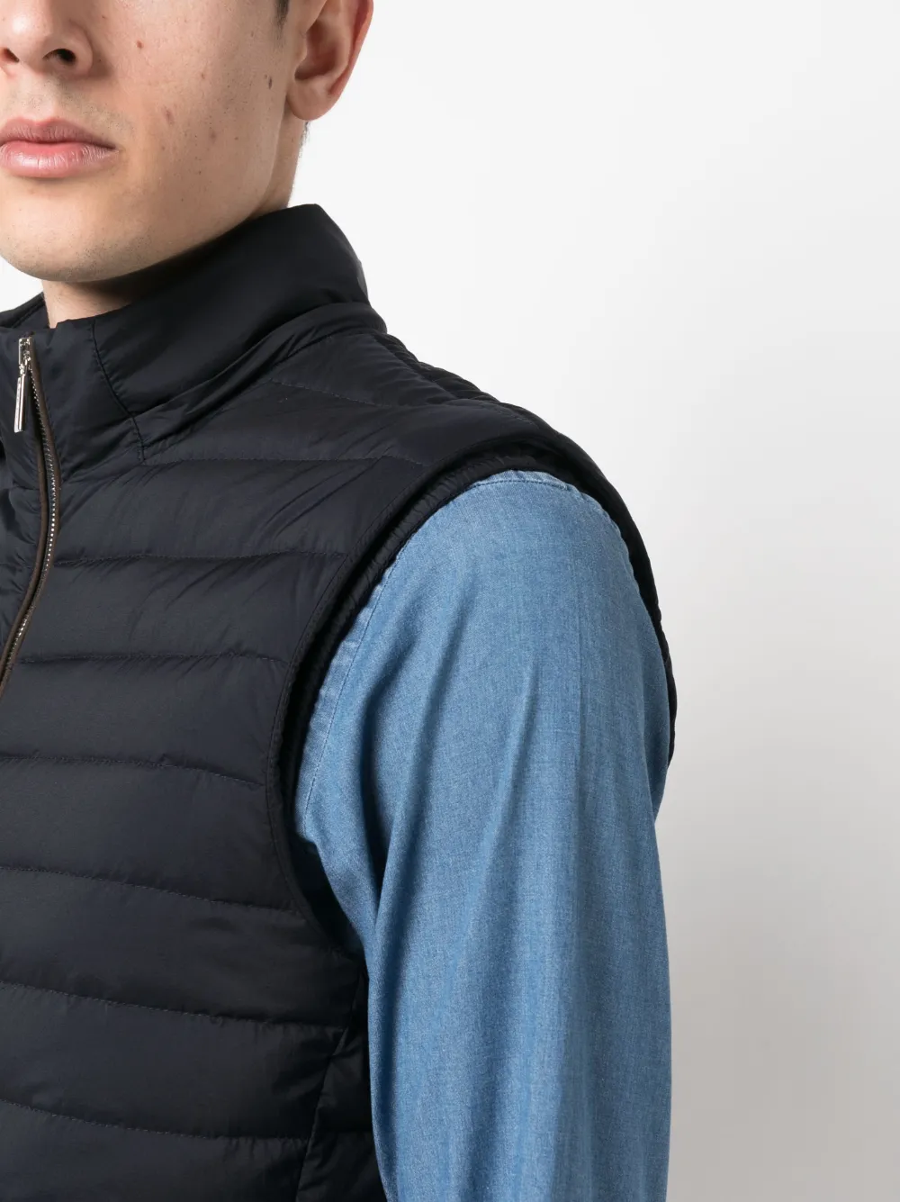 Темно-синий, наполнитель из пуха и перьев, дутый материал, классический капюшон, застежка на молнии спереди, длинные рукава, съемные рукава и два кармана по бокам.