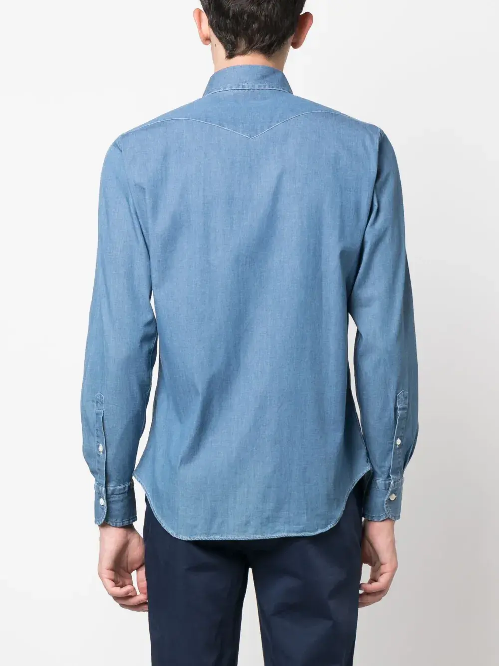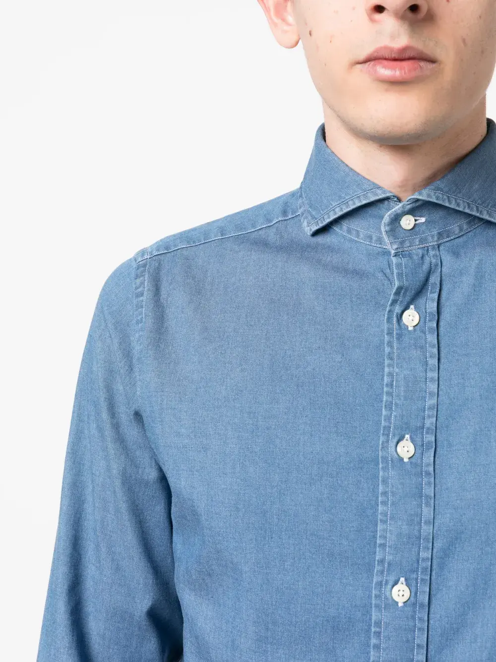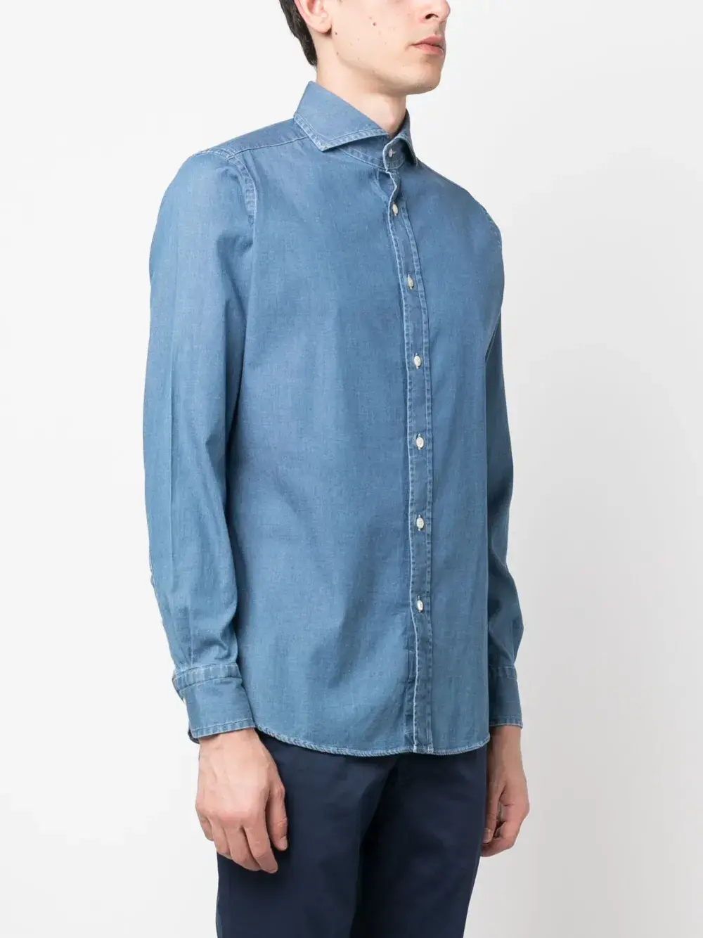 Васильковый, хлопок, классический воротник, застежка на пуговицах спереди, длинные рукава и манжеты на пуговицах.