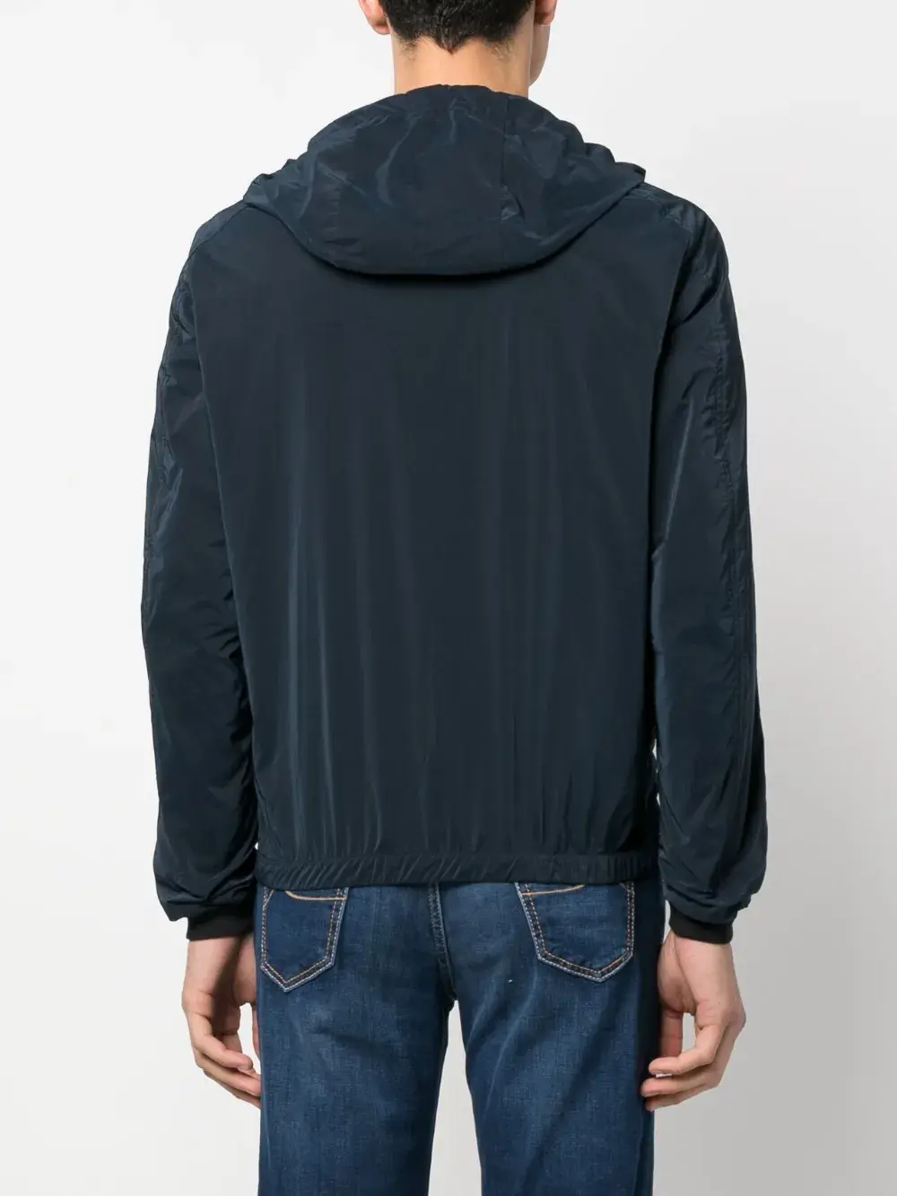 Синий, затягивающийся на шнурок капюшон, застежка на молнии спереди, длинные рукава, манжеты в рубчик, два кармана на молнии по бокам, эластичный подол и прямой подол.