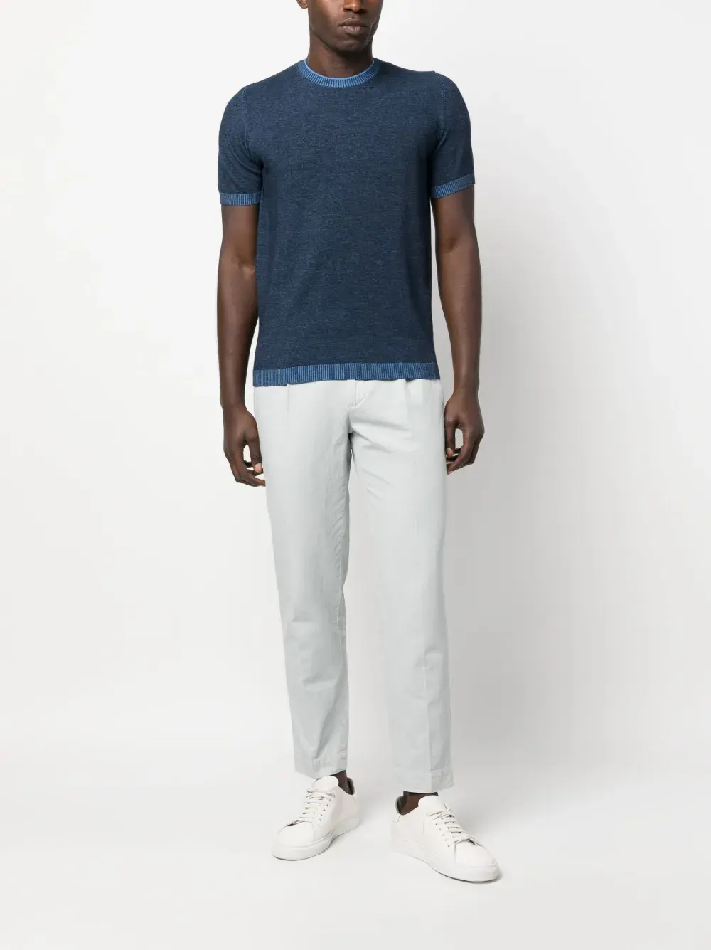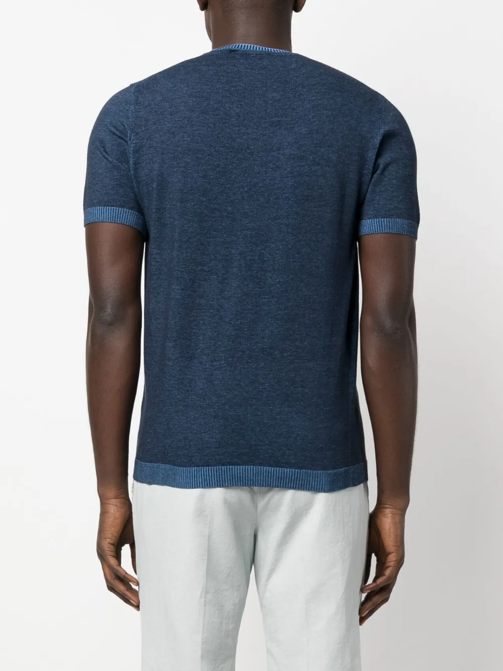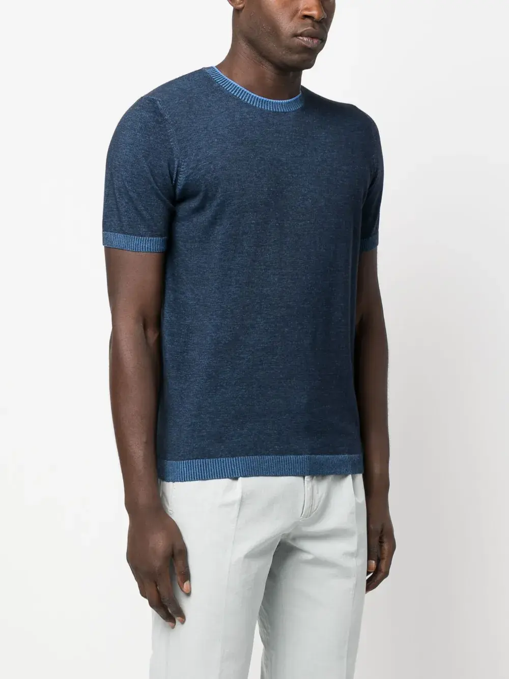 Темно-синий, хлопок, трикотажный материал, фактурная поверхность, круглый вырез, короткие рукава и прямой подол.
