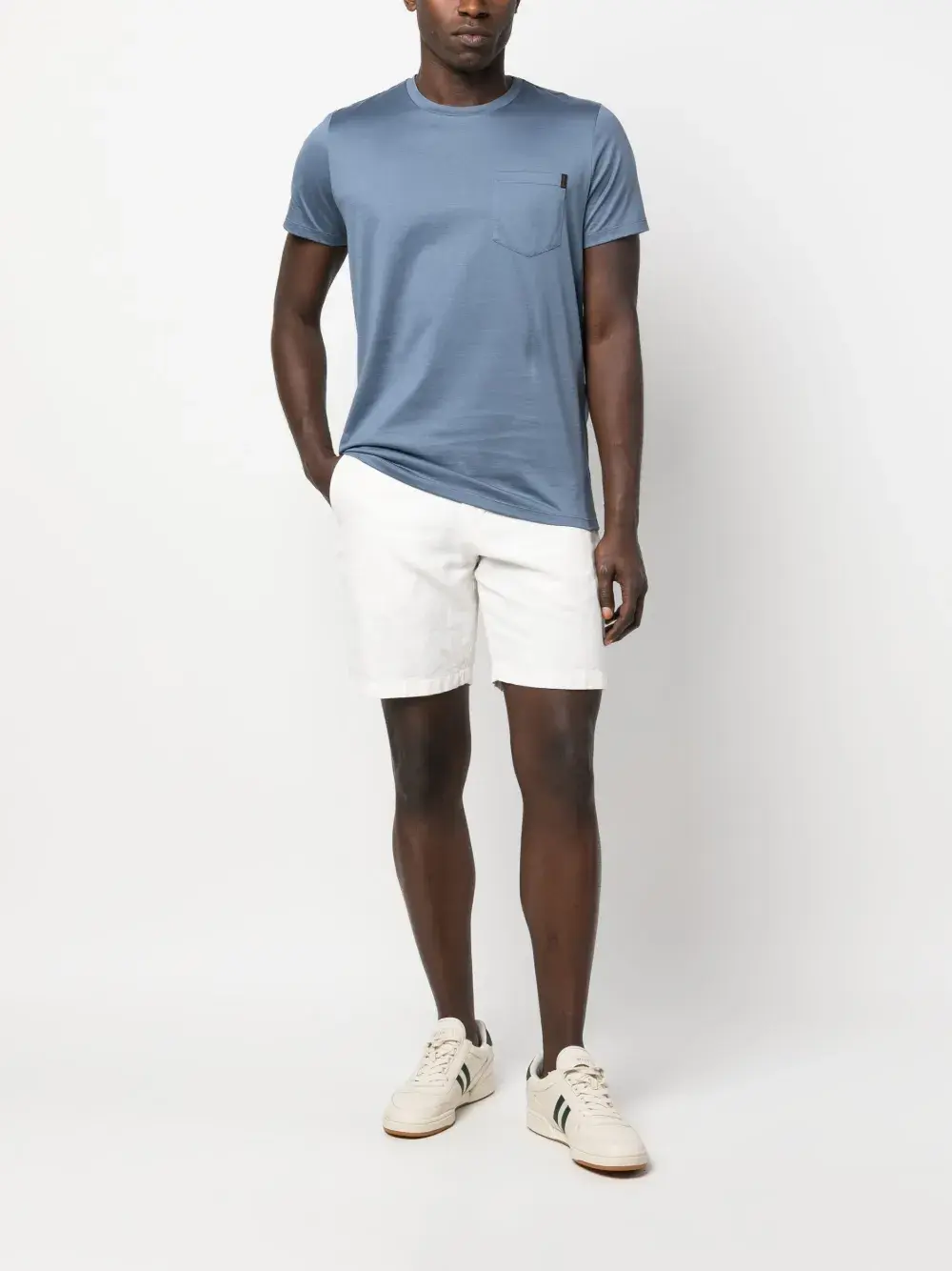 Синий, хлопок, круглый вырез, короткие рукава, нагрудный накладной карман и прямой подол.