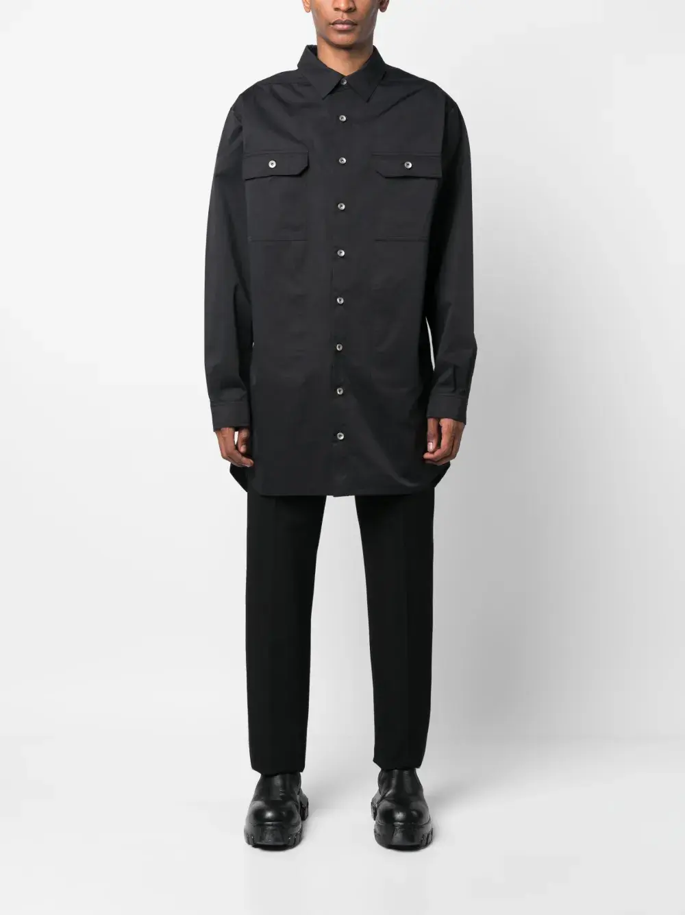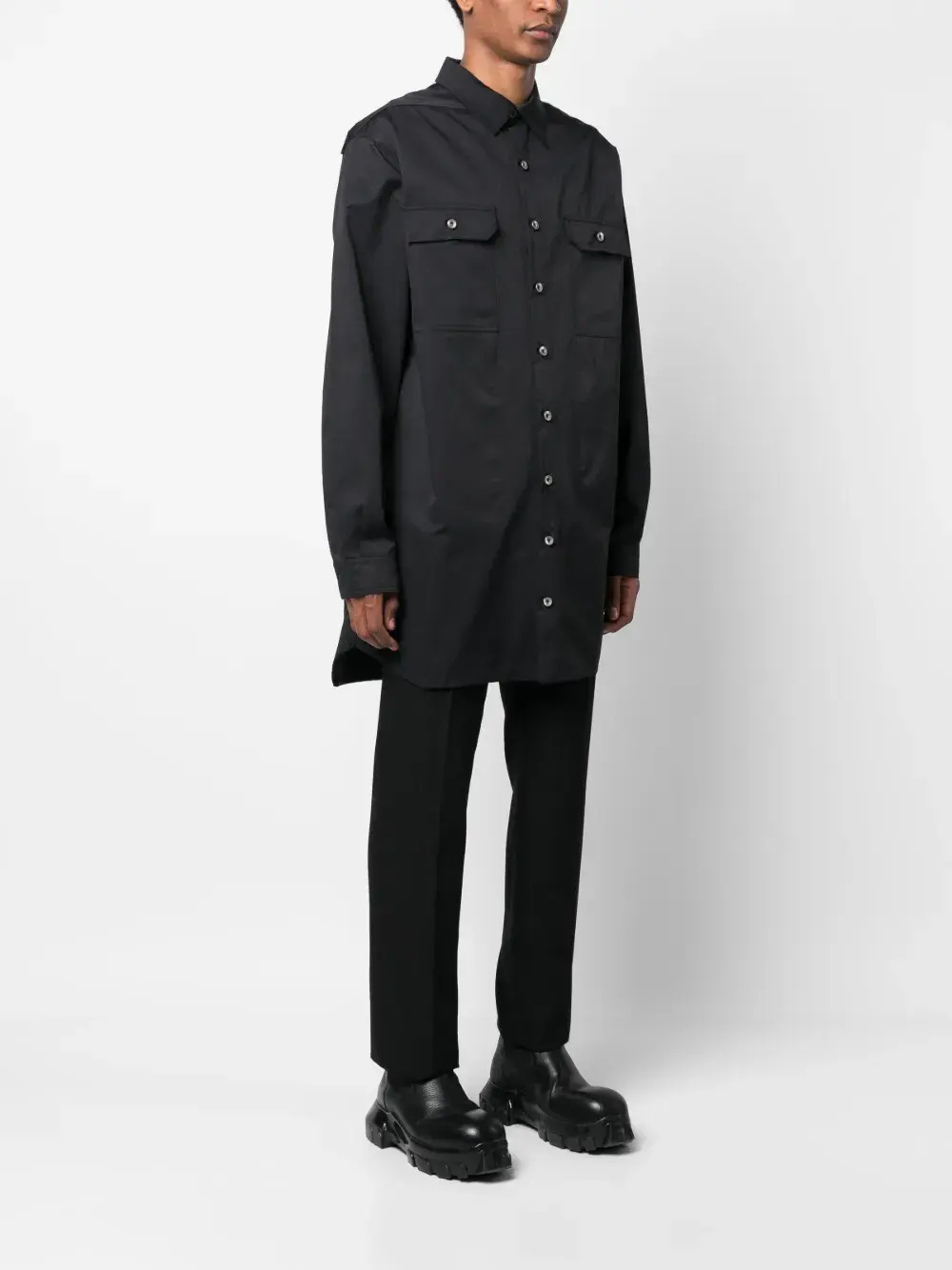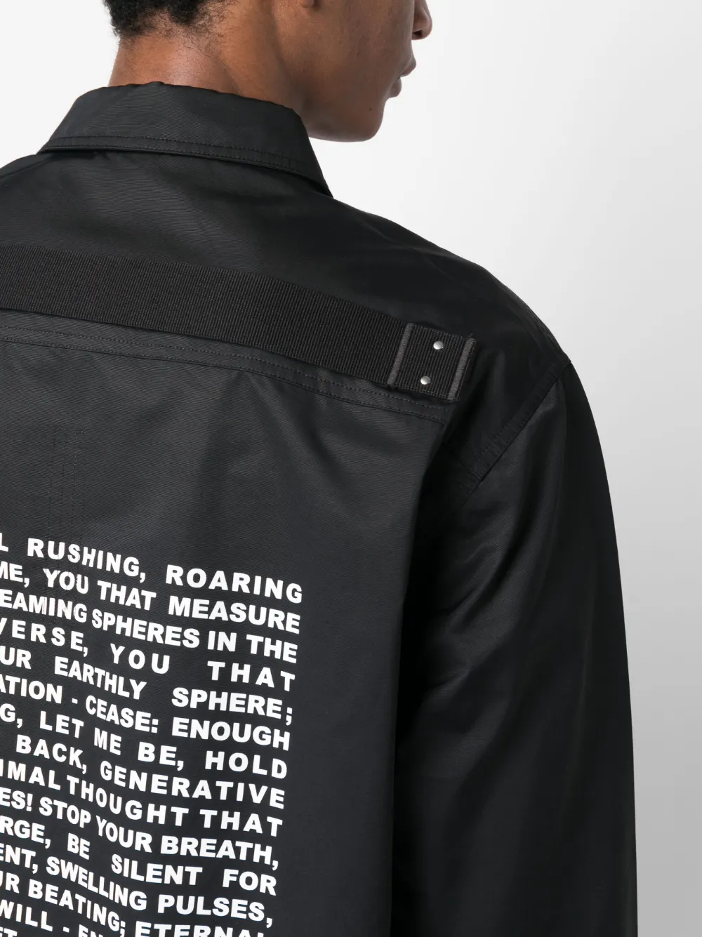 Черный, хлопок, текстовый принт, плоский заостренный воротник, застежка на пуговицах спереди, длинные рукава и два нагрудных кармана с клапанами.