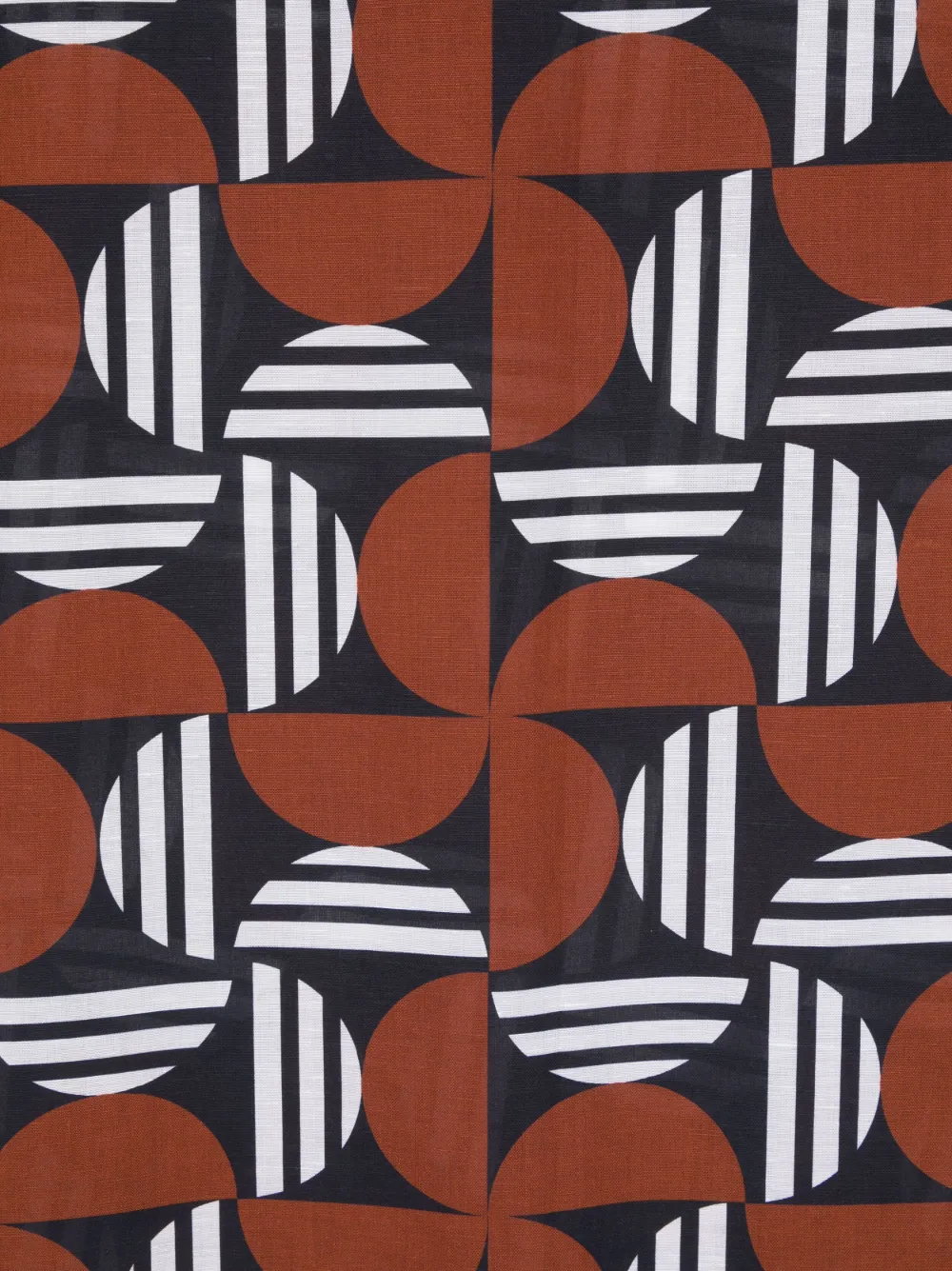 Темно-синий, каштановый, белый, смесь хлопка и льна, сплошной графичный принт, прямоугольная форма и необработанные края.