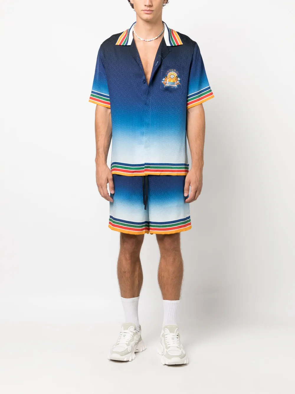 Синий, разноцветный, шелк, эффект омбре, жаккард с монограммой, принт на груди, графичный принт на спине, края в полоску, зазубренный воротник, потайная пуговичная застежка спереди, короткие рукава, нагрудный накладной карман и прямой подол.