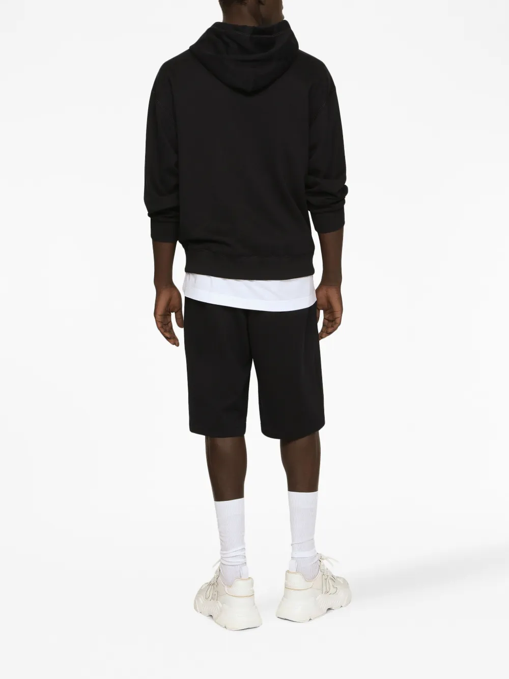 Черный, хлопок, металлический логотип, кулиска на талии, карман на молнии сзади, длина по колено и прямой подол.