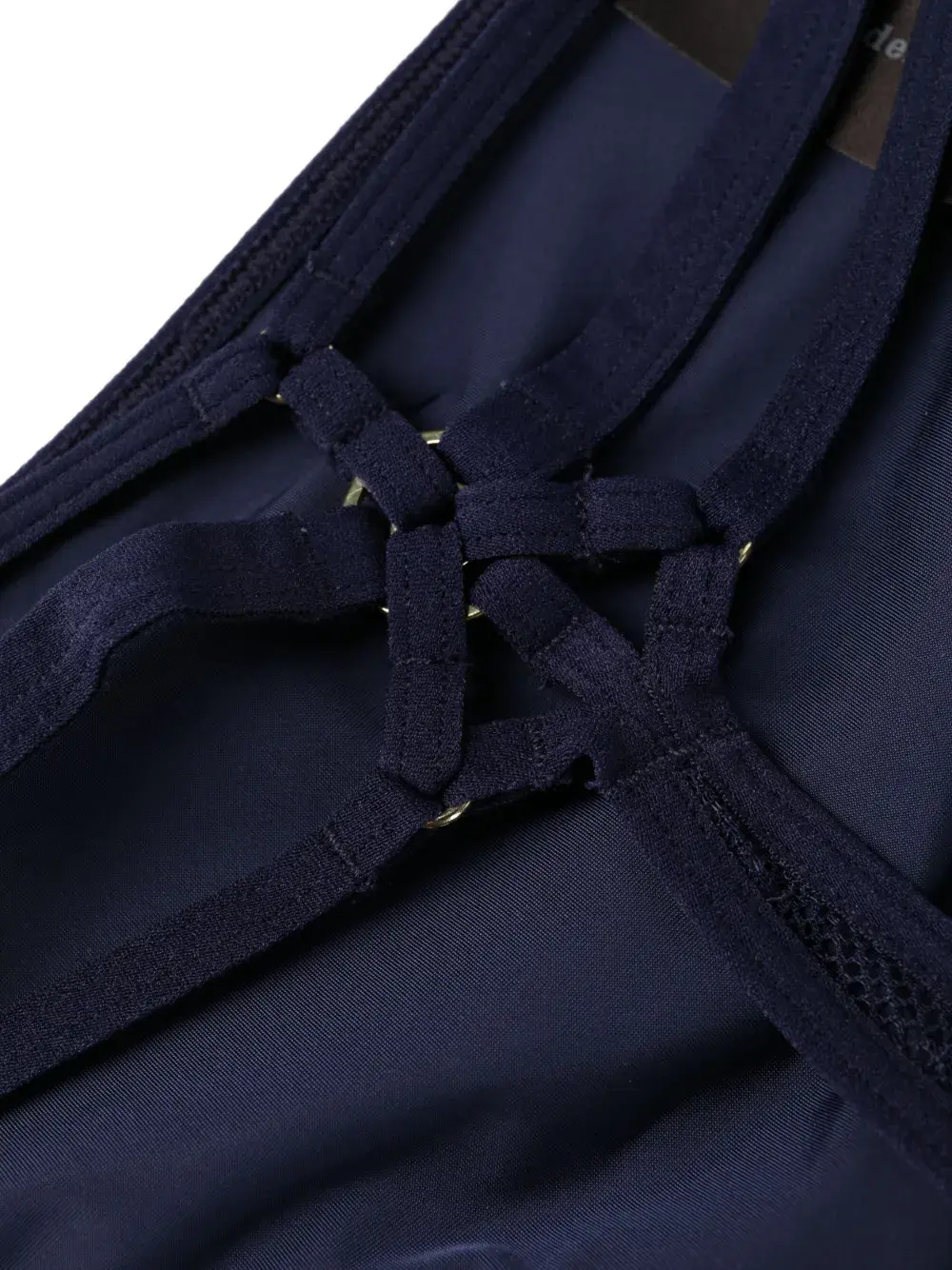 Темно-синий, кружевные вставки, ремешки и стринги. Эту вещь можно примерить, но только поверх собственного белья. Узнать больше о том, какие товары получают отметку «Ответственный выбор», можно из материала «Как мы оцениваем экологичность и этичность».