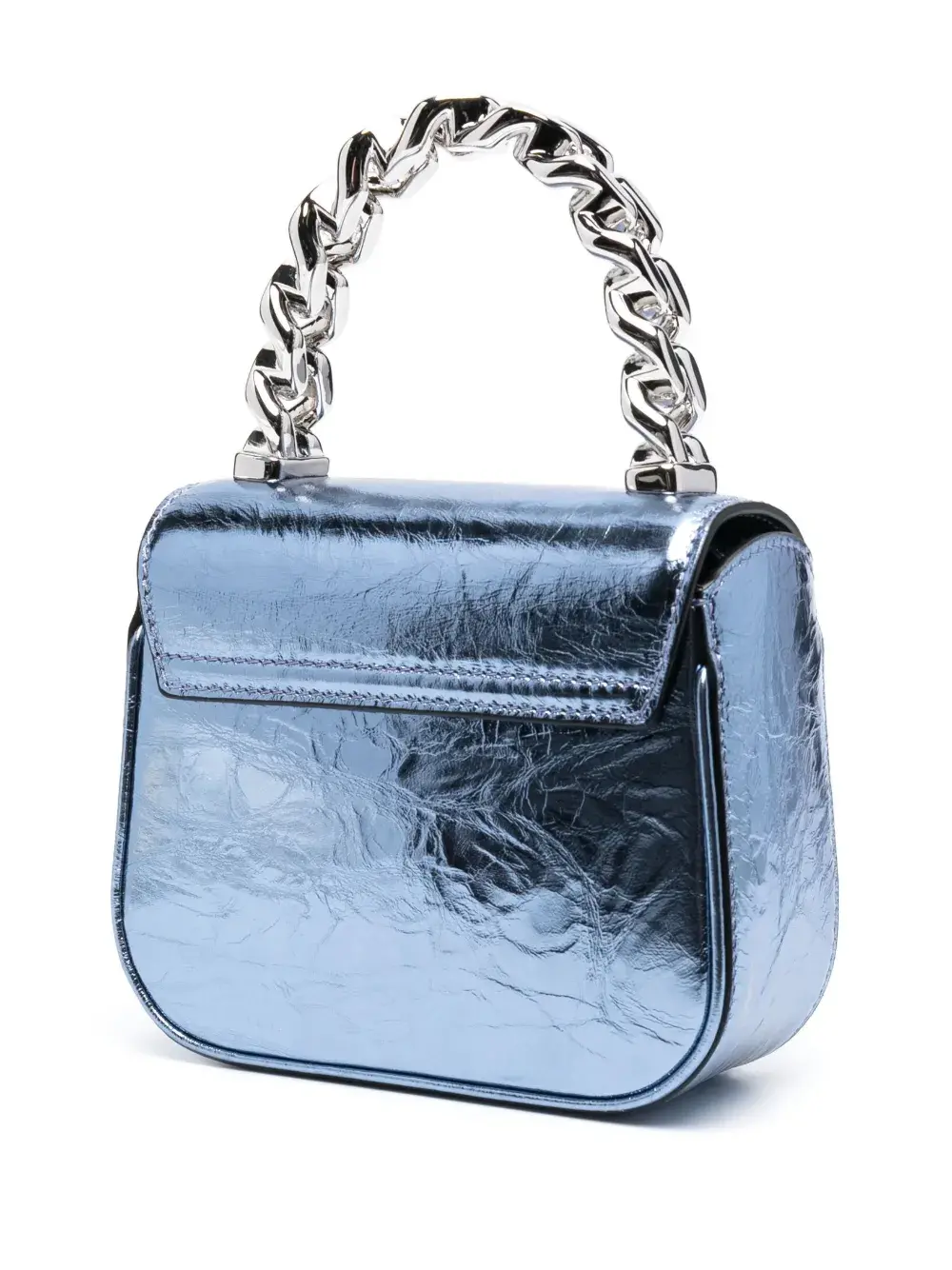 Синий, телячья кожа, эффект металлик, декор Medusa, серебристая фурнитура, откидной клапан, цепочный ремень, регулируемый ремень на плечо и основное отделение.