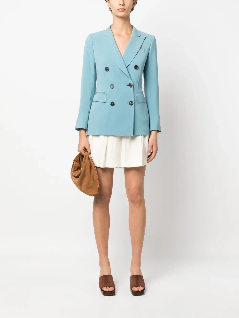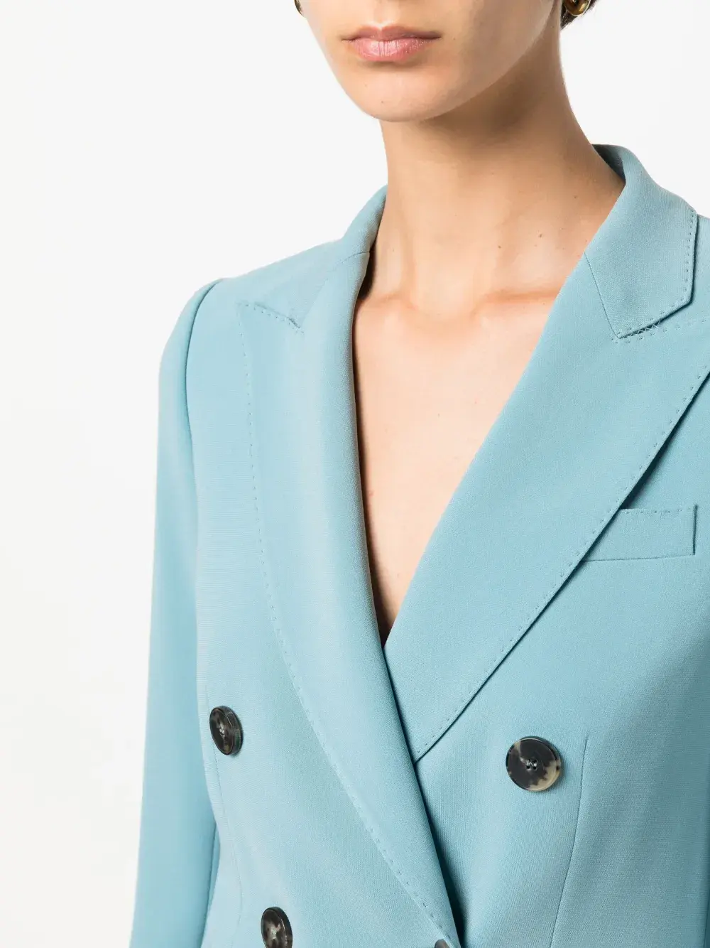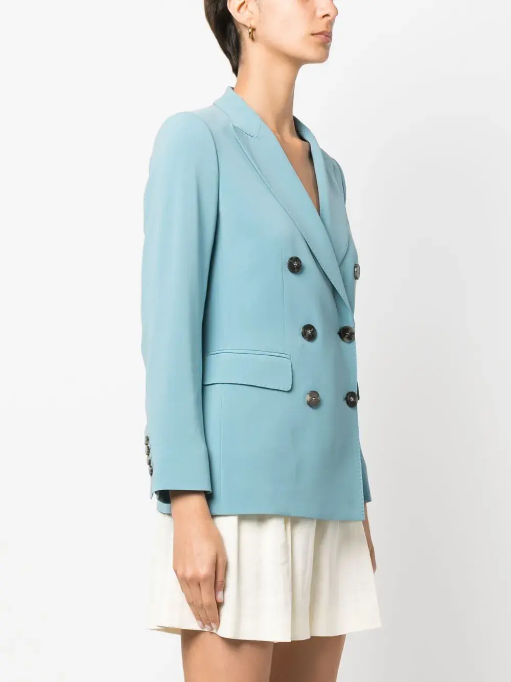 Голубой, заостренные лацканы, двубортная застежка на кнопки, длинные рукава, манжеты на пуговицах, прорезной карман на груди, два кармана с клапанами по бокам, шлица по центру сзади и прямой подол.