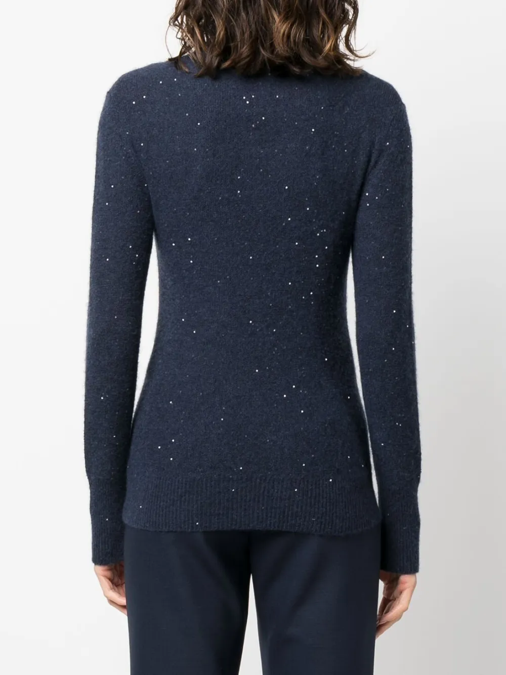Темно-синий, трикотажный материал, украшение из пайеток, высокий воротник и длинные рукава.
