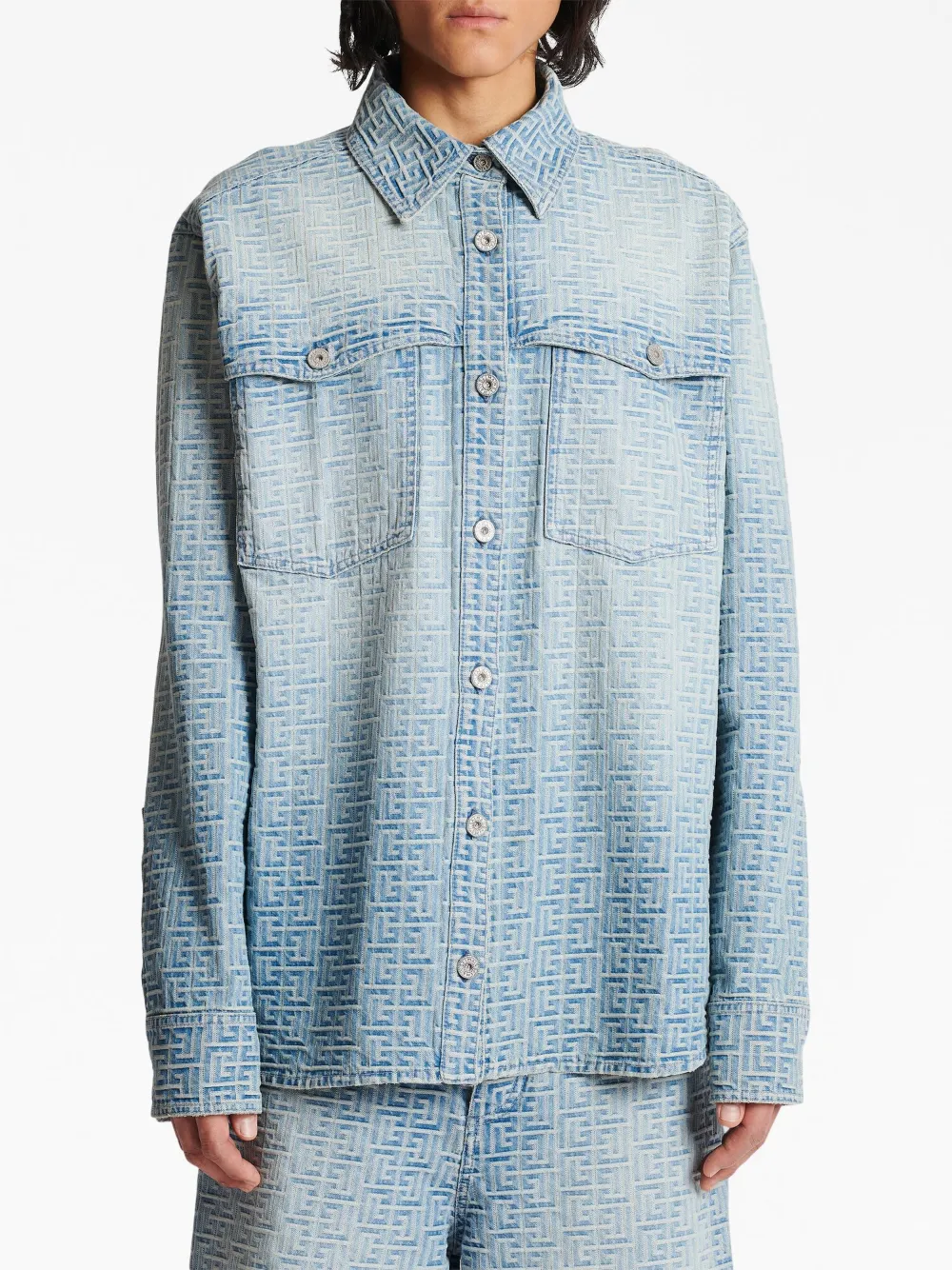 Голубой, хлопок, жаккард с монограммой, прямой воротник, застежка на пуговицах спереди, нагрудный карман на пуговице, длинные рукава, рукава с манжетами на пуговицах и прямой подол.