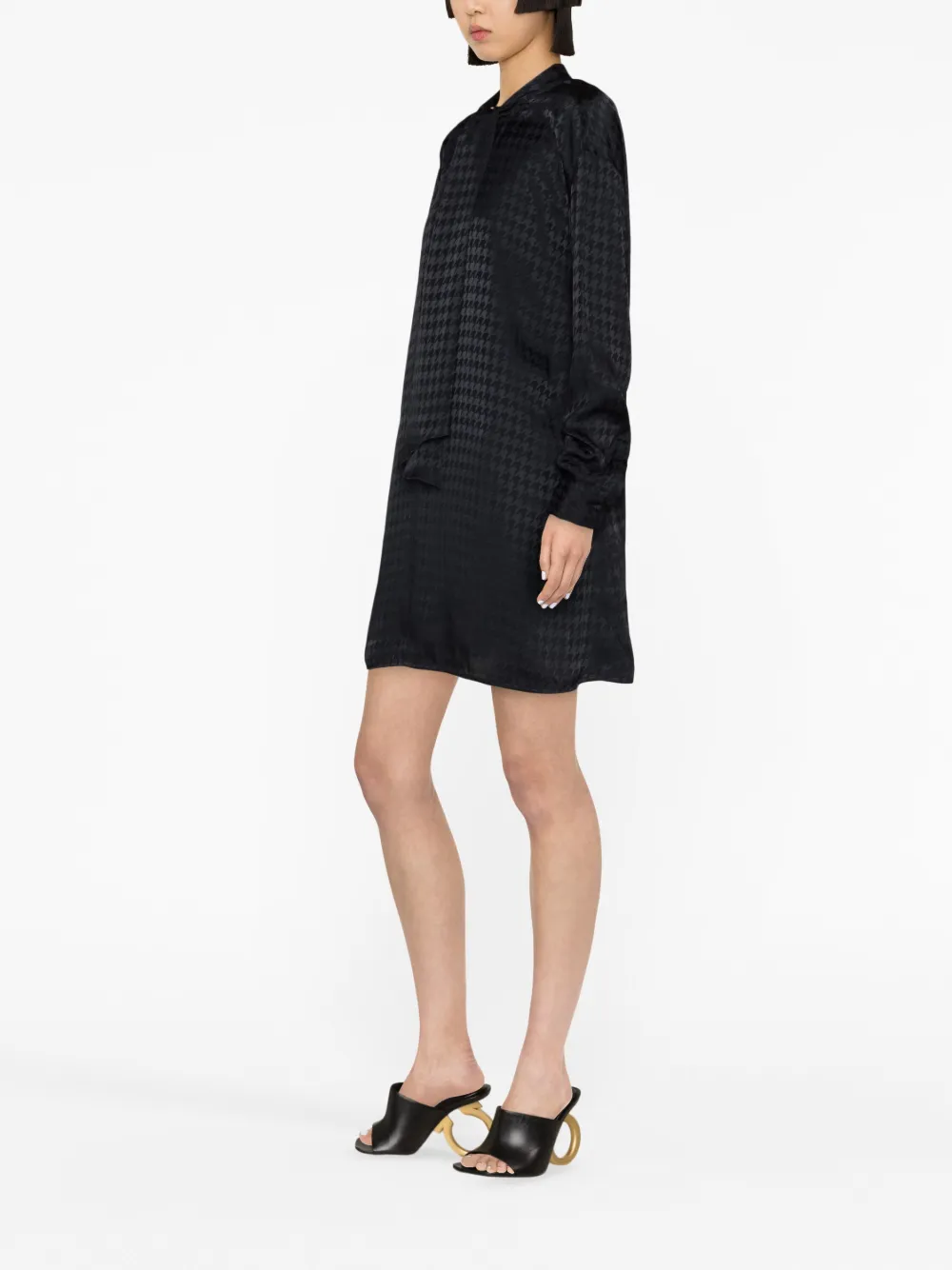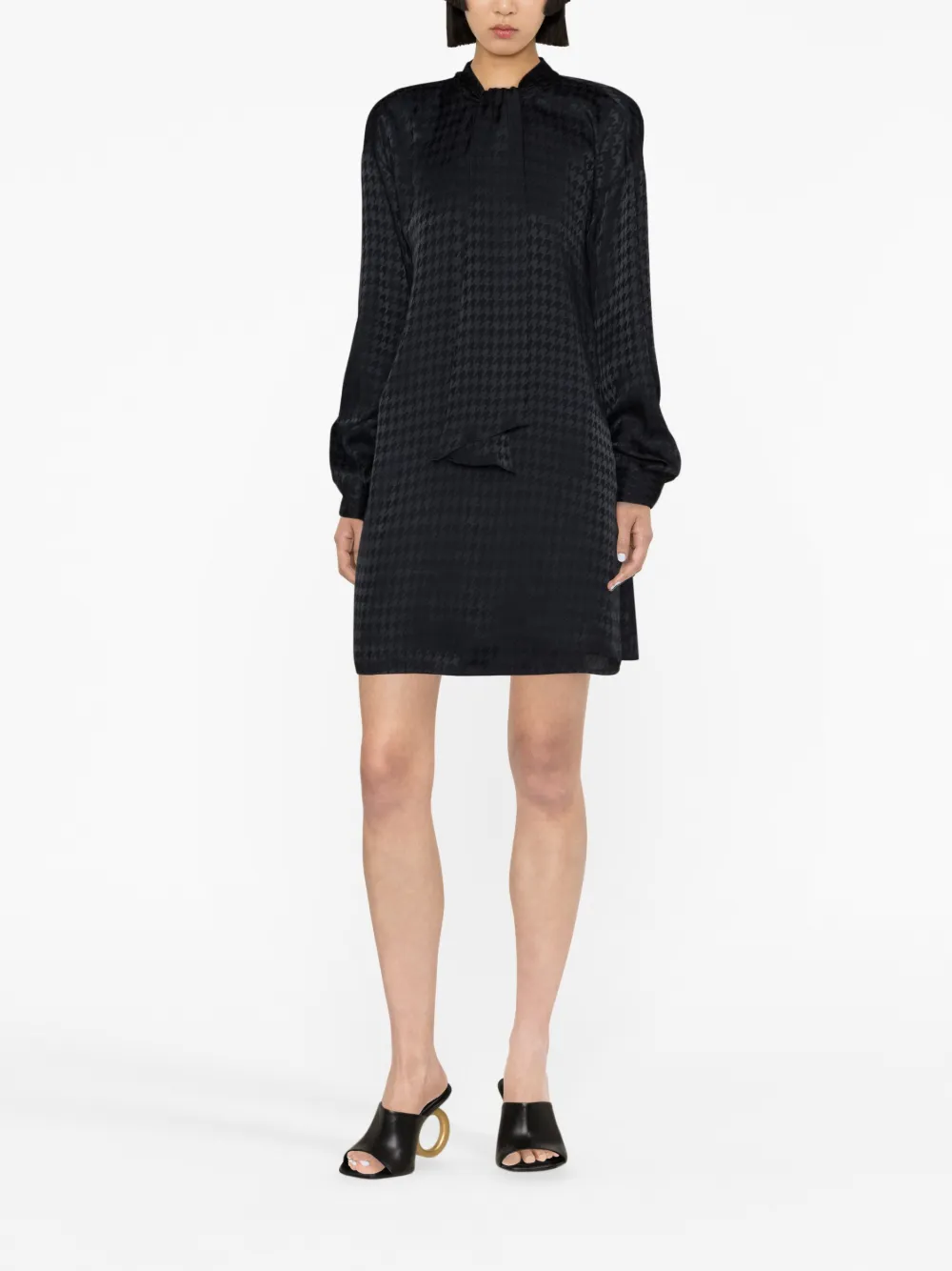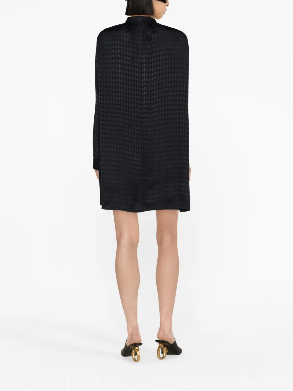 Темно-синий, смесовый шелк, принт в ломаную клетку, круглый вырез, завязки спереди, длинные рукава и длина до бедер.