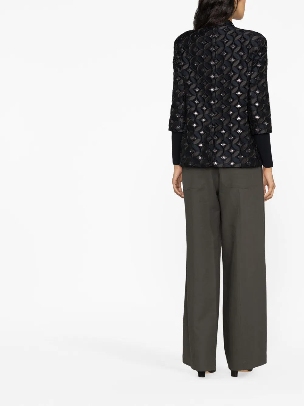 Темно-синий, шелк, вышивка, зазубренные лацканы, двубортная застежка на кнопки, длинные рукава, два накладных кармана по бокам и прямой подол.