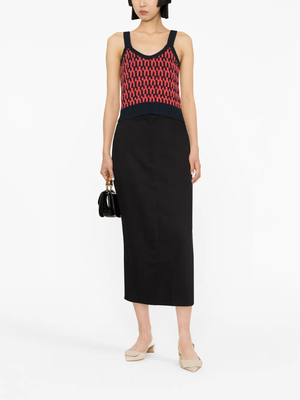 Темно-синий, янтарно-оранжевый, сочетание двух оттенков, трикотажный материал, смесовый хлопок, без рукавов, детали в рубчик, прямой подол и укороченная длина.
