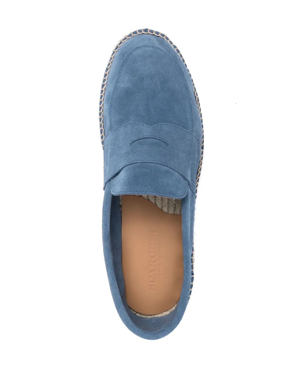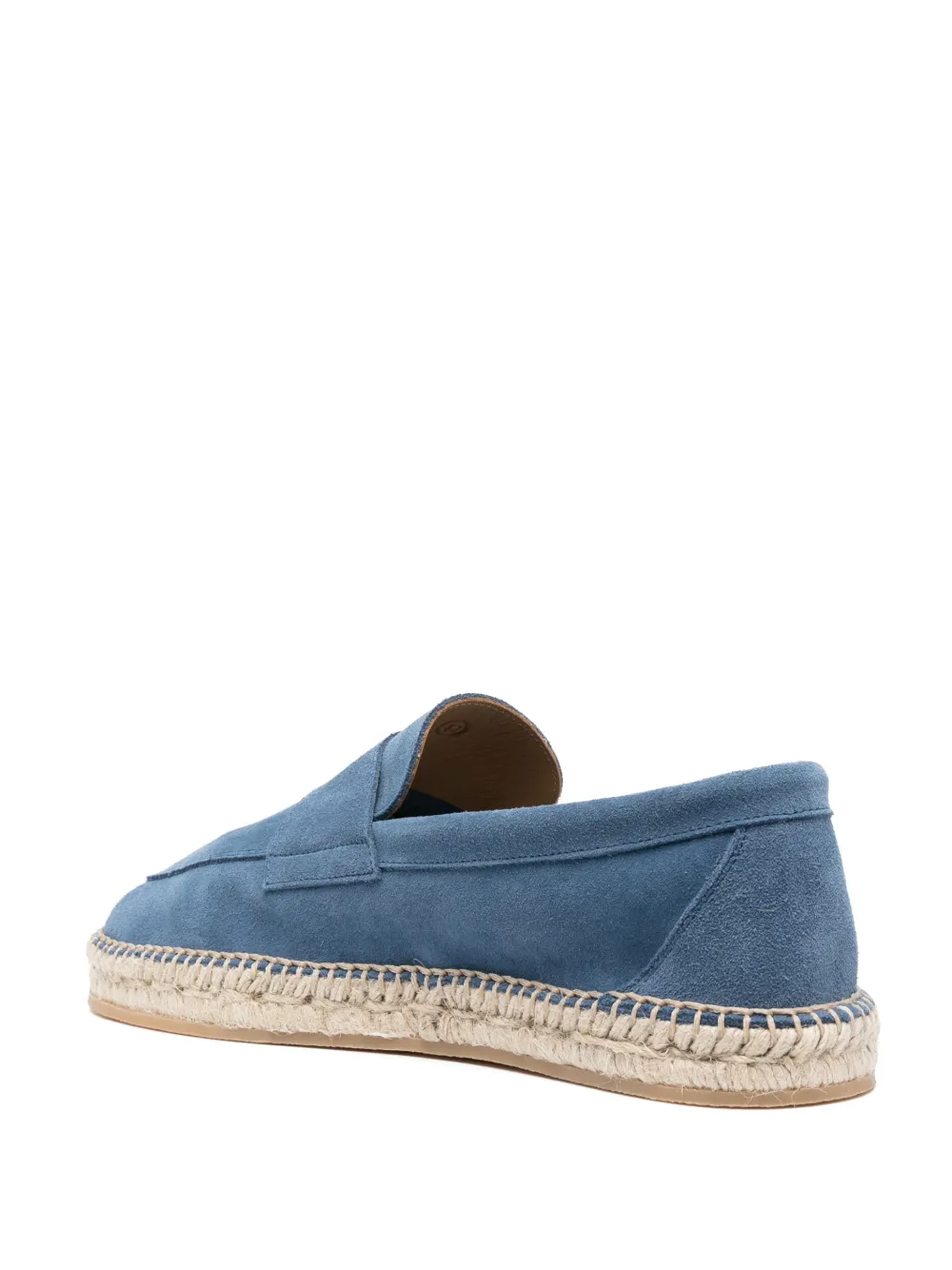Синий, замша, миндалевидный носок, джутовая подошва, модель без застежки, плоская резиновая подошва и кожаная стелька с логотипом.