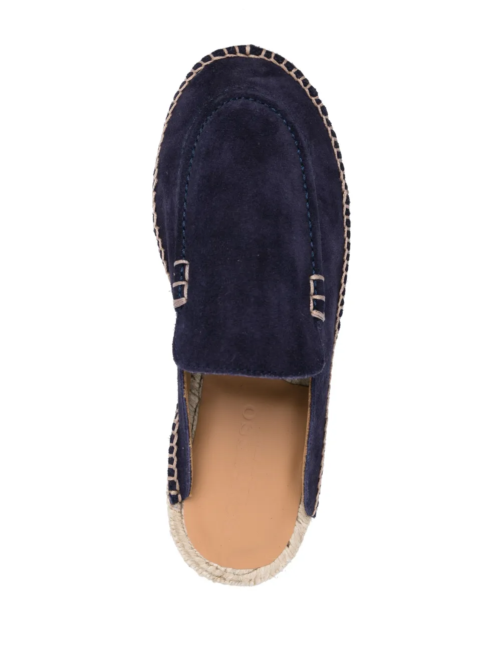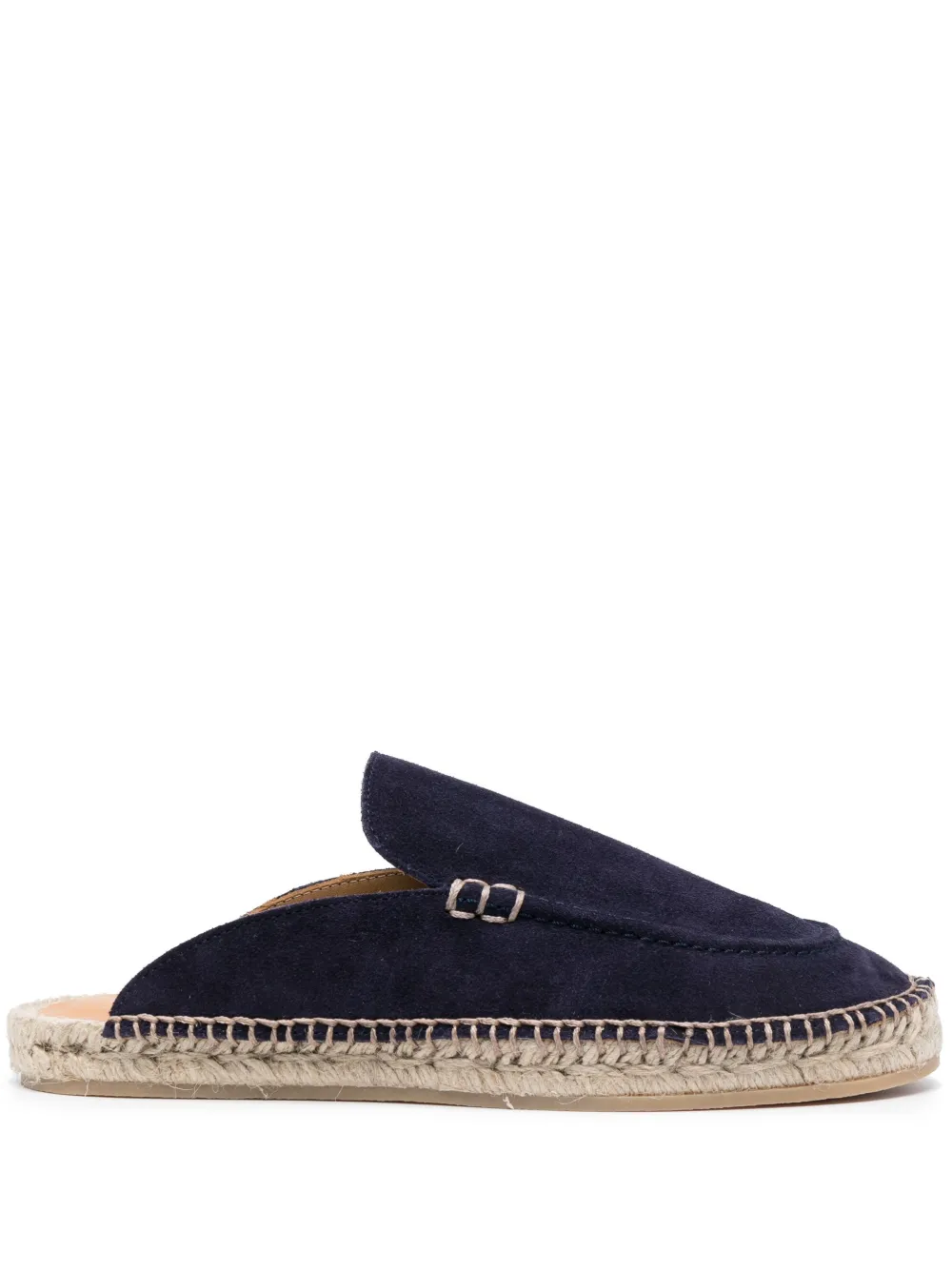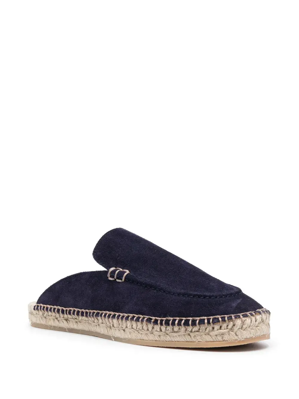 Темно-синий, замша, миндалевидный носок, джутовая подошва, модель без застежки, плоская резиновая подошва и кожаная стелька с логотипом.