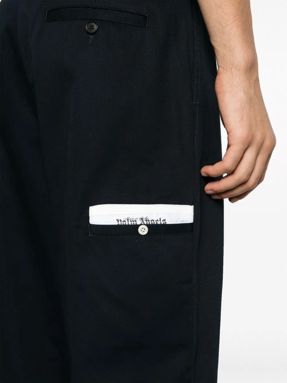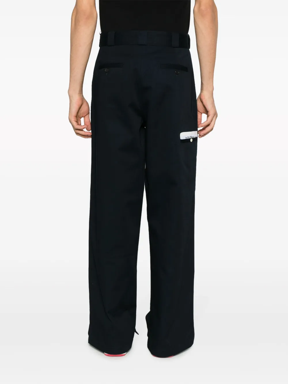 Темно-синий, хлопок, маленькая подвеска с логотипом, средняя посадка, петли для ремня, потайная застежка спереди, прорезной карман на пуговице сзади и прямой крой.