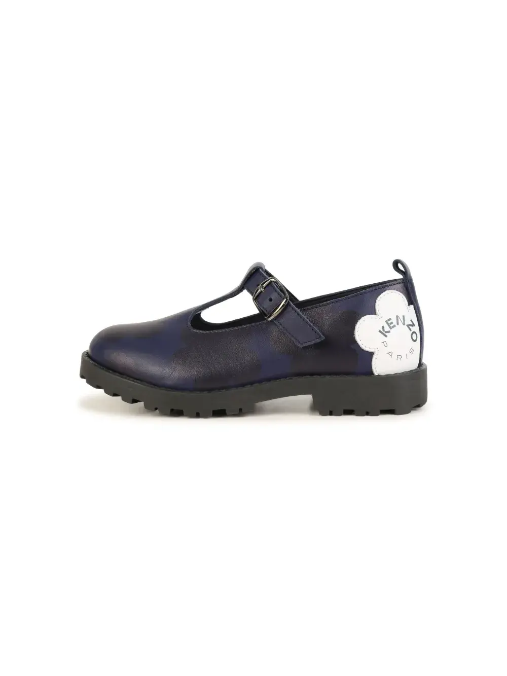 Темно-синий, кожа наппа, узор Boke Flower, логотип сбоку, петля для подтягивания сзади, закругленный носок, боковые застежки с пряжками, стелька с логотипом и рифленая резиновая подошва.