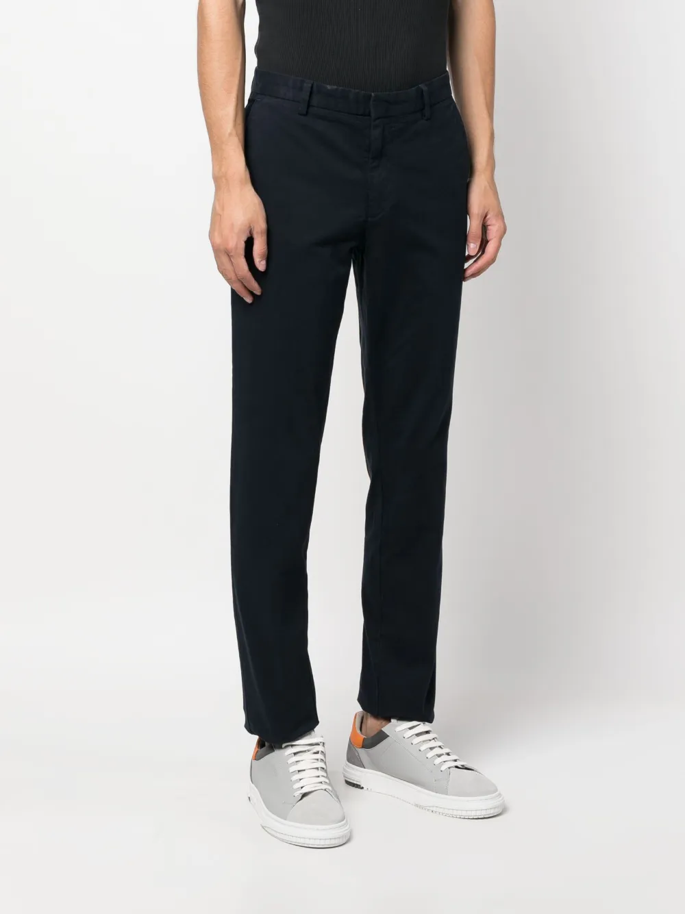 Темно-синий, эластичный хлопок, петли для ремня, потайная застежка спереди, низкая посадка, узкий крой, два вшитых кармана по бокам и два прорезных кармана сзади.