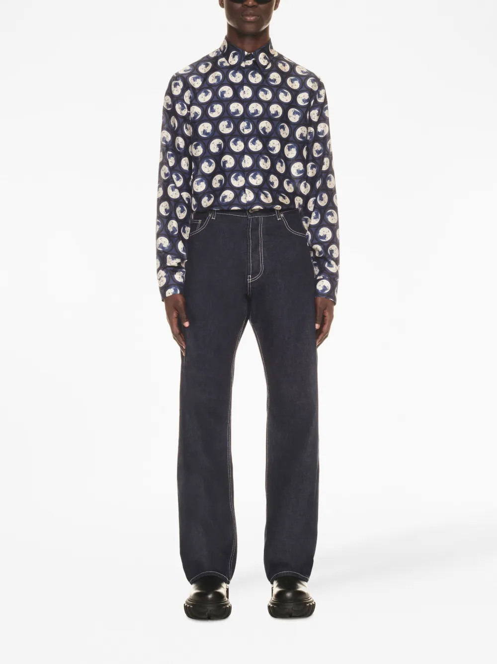 Темно-синий, хлопок, деним, вышитый логотип, контрастная строчка, прямой крой, застежка на пуговицах спереди и пять карманов.