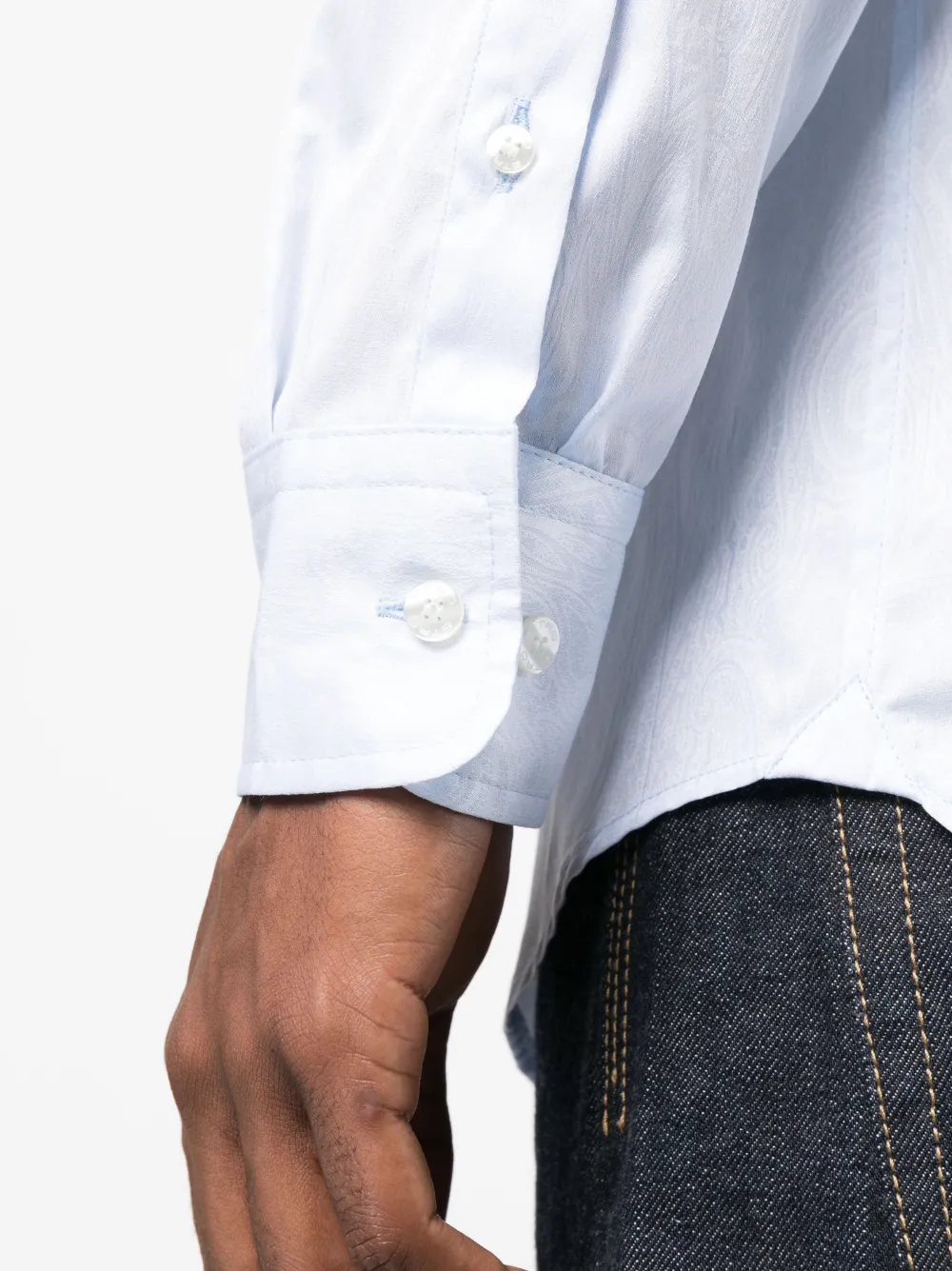 Голубой, вышитый логотип на груди, принт пейсли, классический воротник, застежка на пуговицах спереди, длинные рукава, манжеты на пуговицах и закругленный подол.